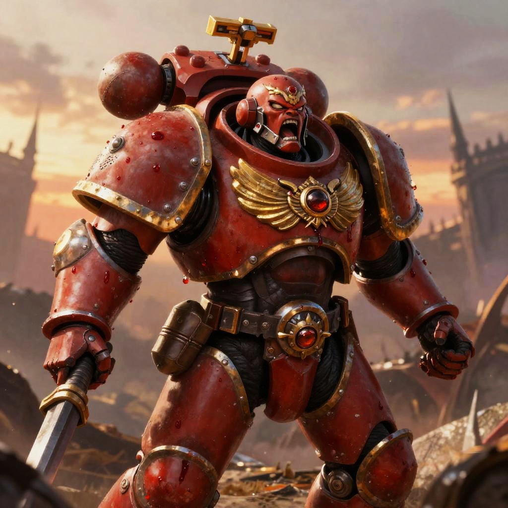 Blood Angels artwork focusing on a bloodthirsty marine mid-roar, red and gold armor reflecting the glow of a sunset battlefield, blood droplets scattered across armor and weapons, intense expression conveying valor and fury, richly textured sci-fi fantasy style illustration.