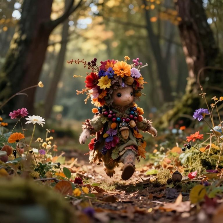 In the whimsical realm of an autumnal fantasy glade, a tiny creature adorned in a vibrant tapestry of dried flowers and leaves prances through the dappled sunlight filtering through the trees from an enchanting 'bug's-eye view'. This ethereal being wears an acorn and berry necklace that glistens like precious gems, evoking a sense of wonder as we peer into her mystical world. The cinematic composition with hyperrealistic details captures both the ethereal beauty and the enchanting atmosphere of this fantastical realm, reflecting an emotional gradient between innocence and enigma reminiscent of old 80's VHS movies.