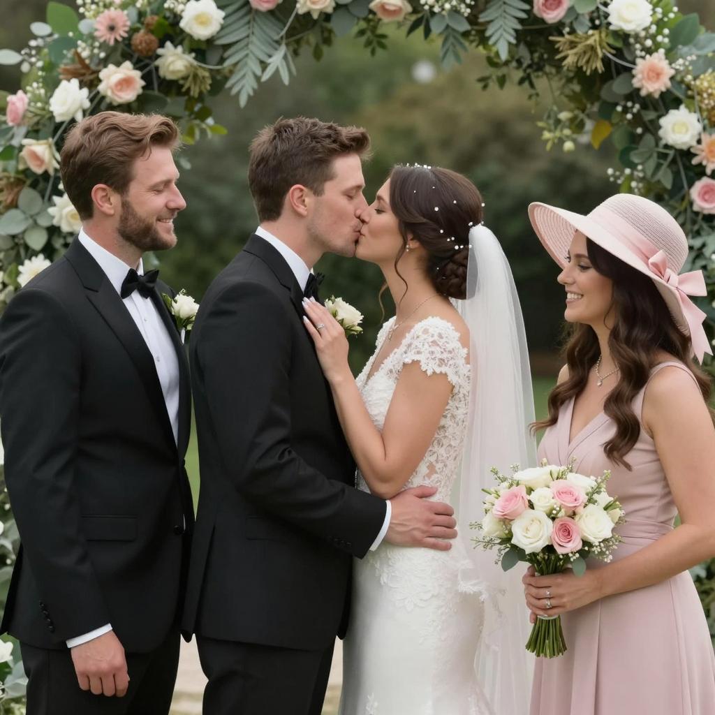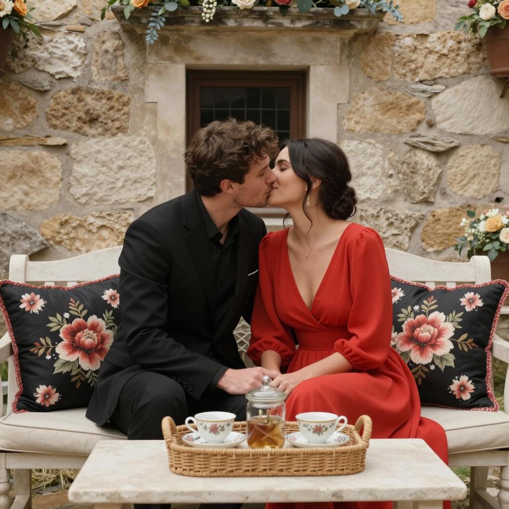 A romantic couple sits close together on a stone bench with decorative floral pillows. The man wears a black suit while the woman wears a long-sleeve red dress with a deep neckline. They share a tender kiss in front of a rustic stone wall with a small window. On the table in front of them is a wicker tray holding two floral teacups and a glass jar. The setting includes floral arrangements above the bench, enhancing the cozy atmosphere.