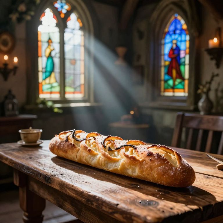 Photograph of a rustic wooden table in a dimly lit church with stained glass windows. The table holds a large, golden-brown loaf of artisan bread with crispy, flaky layers and a small ceramic bowl. Sunlight streams through the colorful, arched stained glass windows in the background, casting beams of light and creating a serene atmosphere. The wooden table and chairs have a weathered texture, enhancing the rustic charm. The stained glass depicts religious figures in vibrant blues, reds, and greens, adding a sacred, historical ambiance to the scene.