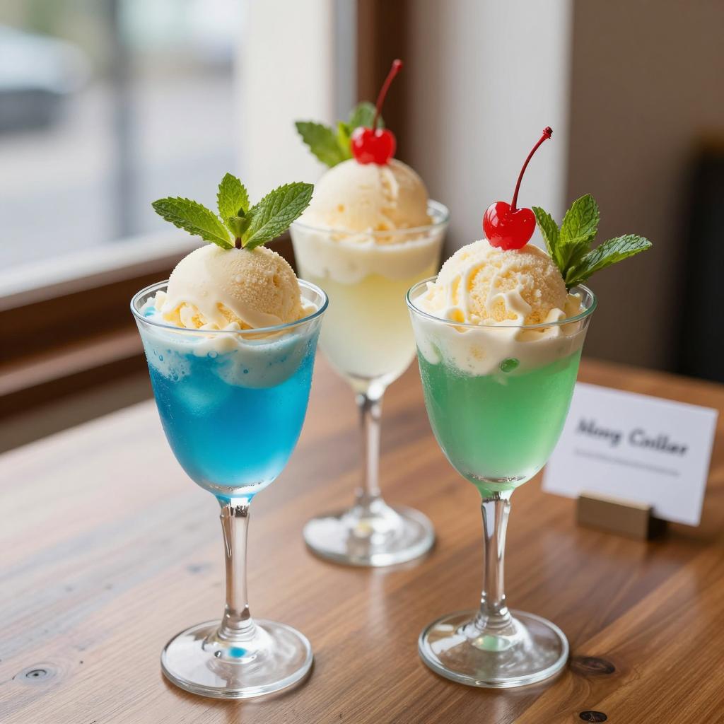 Three frosted glass cocktails on a wooden table. Two blue and one green, each with a scoop of vanilla ice cream, a cherry, and a mint leaf. A small metal stand with a white card on the right. Blurred window background.