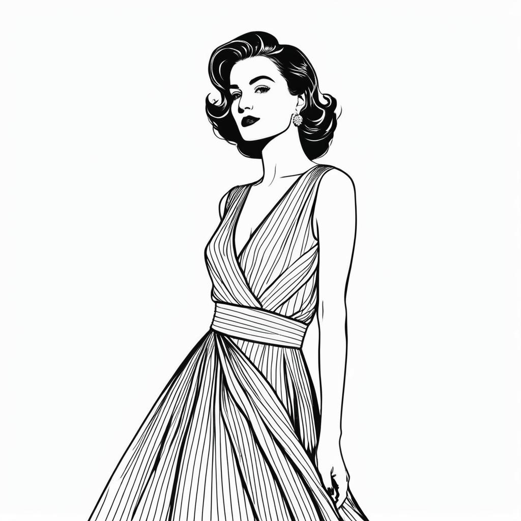 Monochrome retro-style vector illustration of an elegant woman with vintage hairstyle and makeup. The woman is wearing a sleeveless, striped, pleated dress with a deep V neckline, exuding a classy and graceful aura. The image is isolated against a plain white background in continuous line drawing style.
