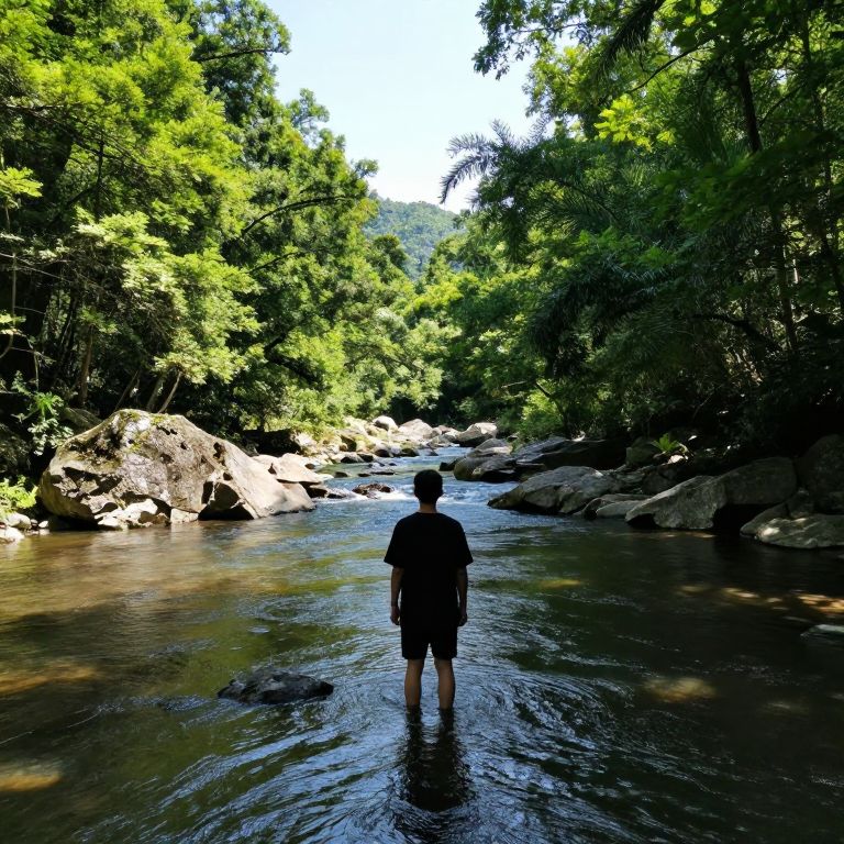 Person standing in shallow, rippling water, facing a serene forested landscape with a narrow river winding through rocky banks and lush greenery under a bright, sunny sky.