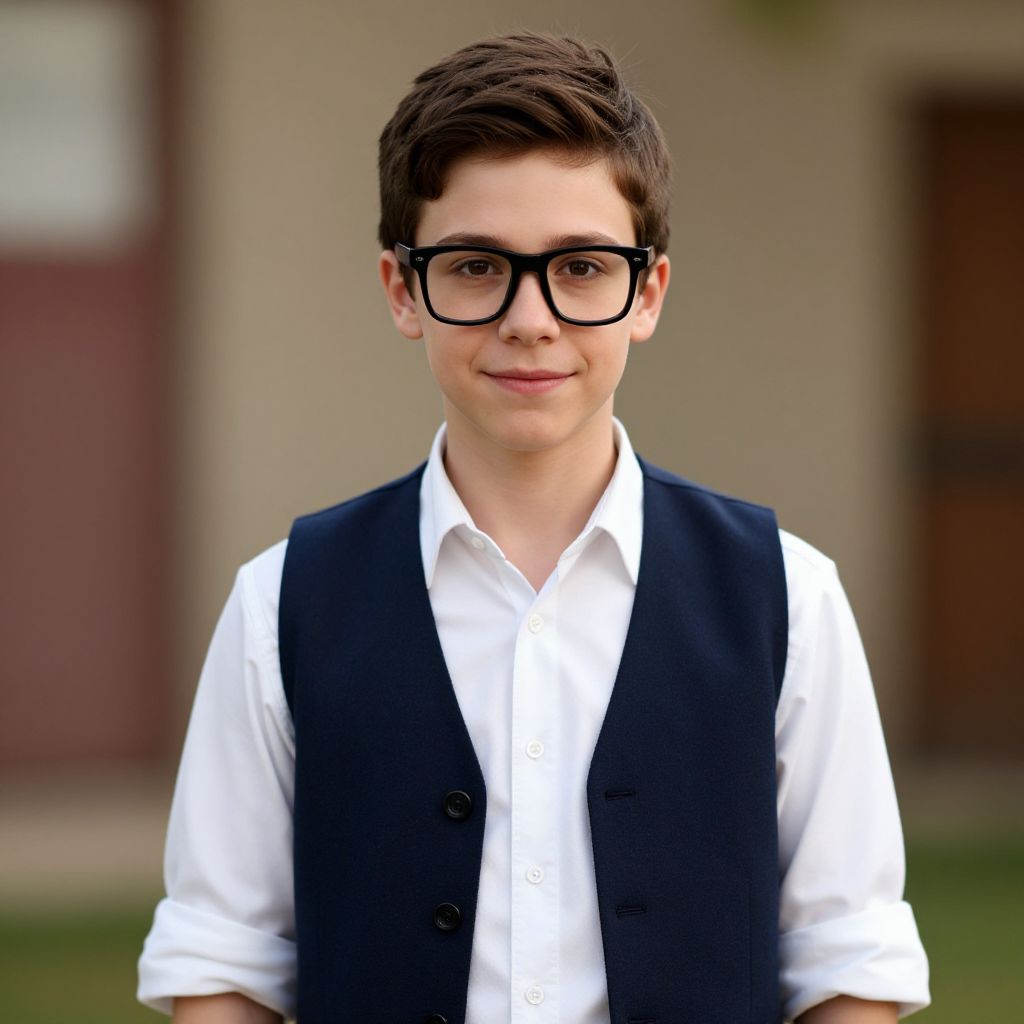 Photograph of a young boy with fair skin, brown tousled hair, and blue eyes, wearing a green, button-up shirt and a matching green hat. He has a slight, friendly smile. The background is blurred, showing indistinct people and a beige building, suggesting an outdoor setting. The boy's green attire contrasts with the soft, muted colors of the background, drawing attention to his face. The image has a shallow depth of field, focusing sharply on the boy while the background remains out of focus. The overall style is bright and cheerful.