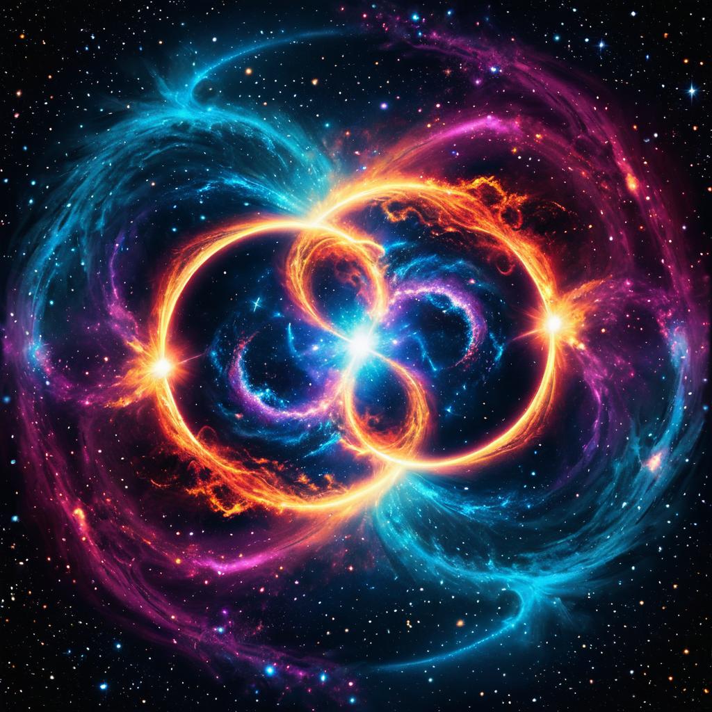 Vibrant fictional artwork logo depicting two intertwined nebulae in space, swirling with bright blues, purples, and oranges. The celestial bodies create a cosmic dance with glowing gases and ethereal light effects, symbolizing protection and connectivity in a mystical cosmic environment.