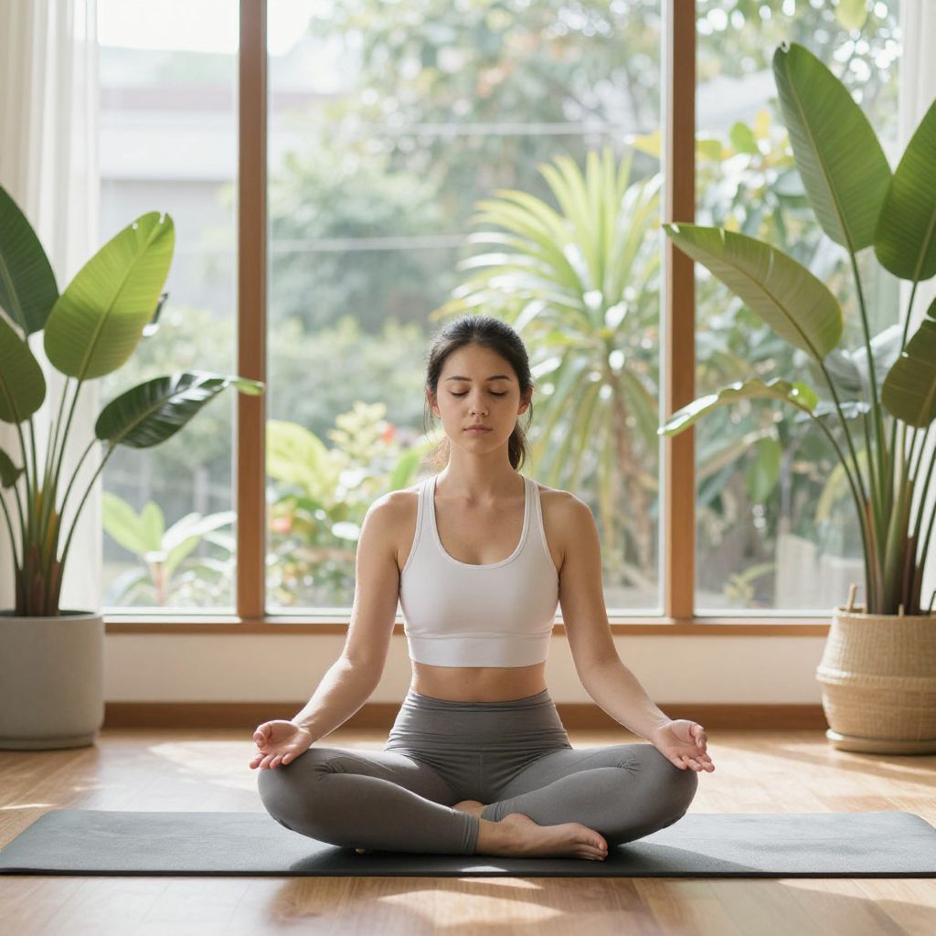 Woman meditating serenely in a well-lit room with large windows, surrounded by green plants and natural light streaming through, while seated cross-legged on a yoga mat.