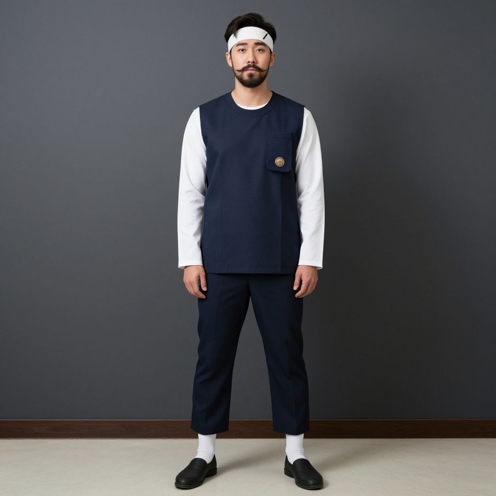 Knit wear man costume, 1boy, male focus, solo, pants, black hair, standing, facial hair, long sleeves, smile, blurry, mustache, striped pants, realistic, shirt, striped clothes