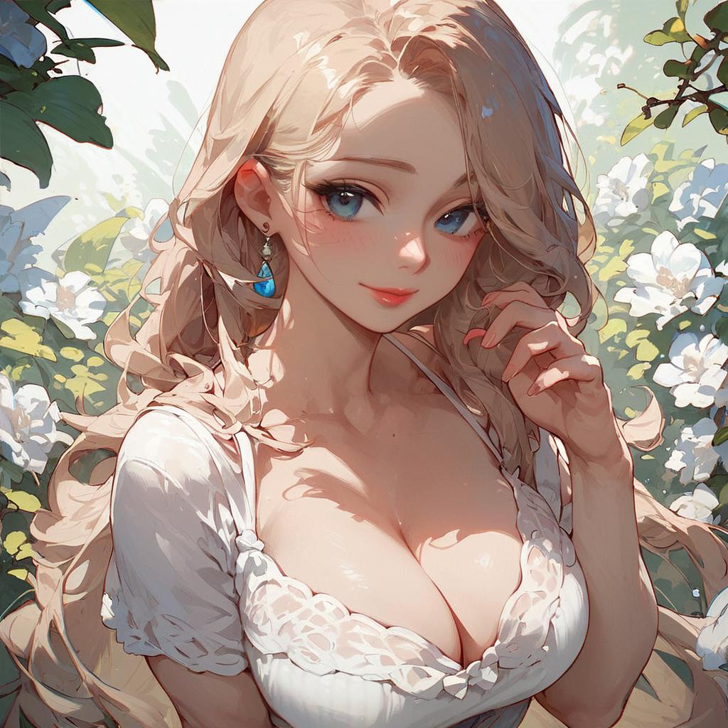 Digital anime-style drawing of a beautiful young woman with long, wavy blonde hair and large blue eyes. She has fair skin and is wearing a white, low-cut lace blouse that accentuates her ample cleavage. She has blue teardrop earrings and is gently touching her hair with one hand. The background is a bright, sunlit garden with white flowers and green leaves. The lighting creates a soft, glowing effect on her face and hair. The overall style is highly detailed and colorful, with a focus on her delicate, feminine features.