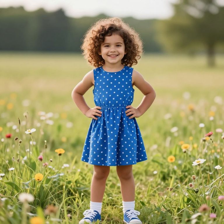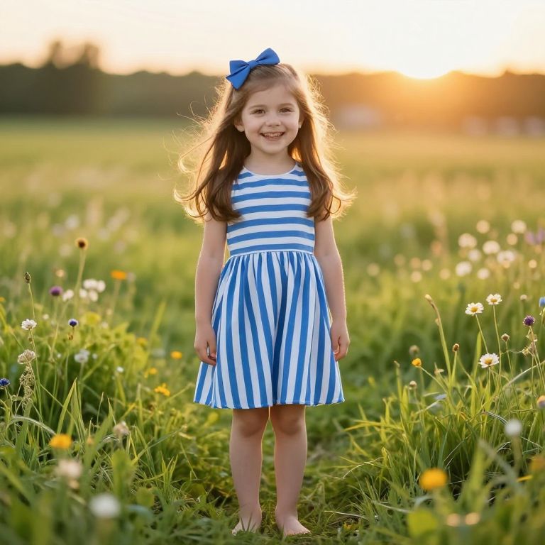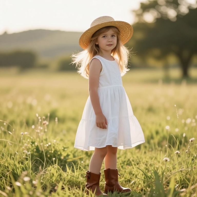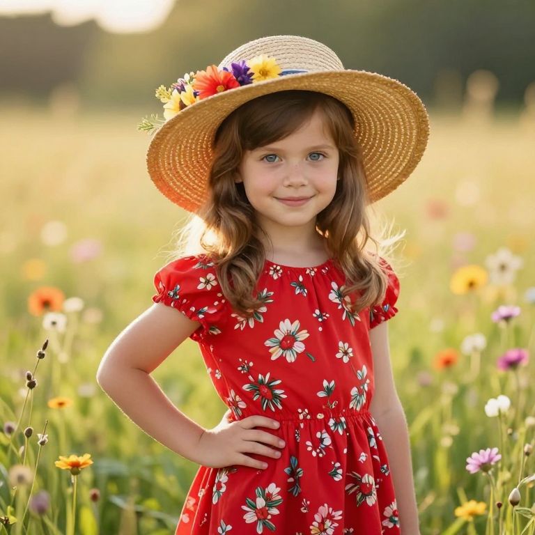 A young girl with bright, curious eyes and a sunny smile is wearing a vibrant yellow dress with a matching yellow hat on her head. She stands confidently in front of a wide, golden cornfield during a warm summer afternoon, the sun casting long shadows across the rows of tall, swaying cornstalks. Her hands are on her hips, gazing at the horizon with a playful and joyful expression, as soft sunlight filters through the leaves, highlighting the rich green of the field and the cheerful colors of her outfit. The scene is peaceful, lively, and full of warmth, evoking a sense of simple happiness and natural beauty.