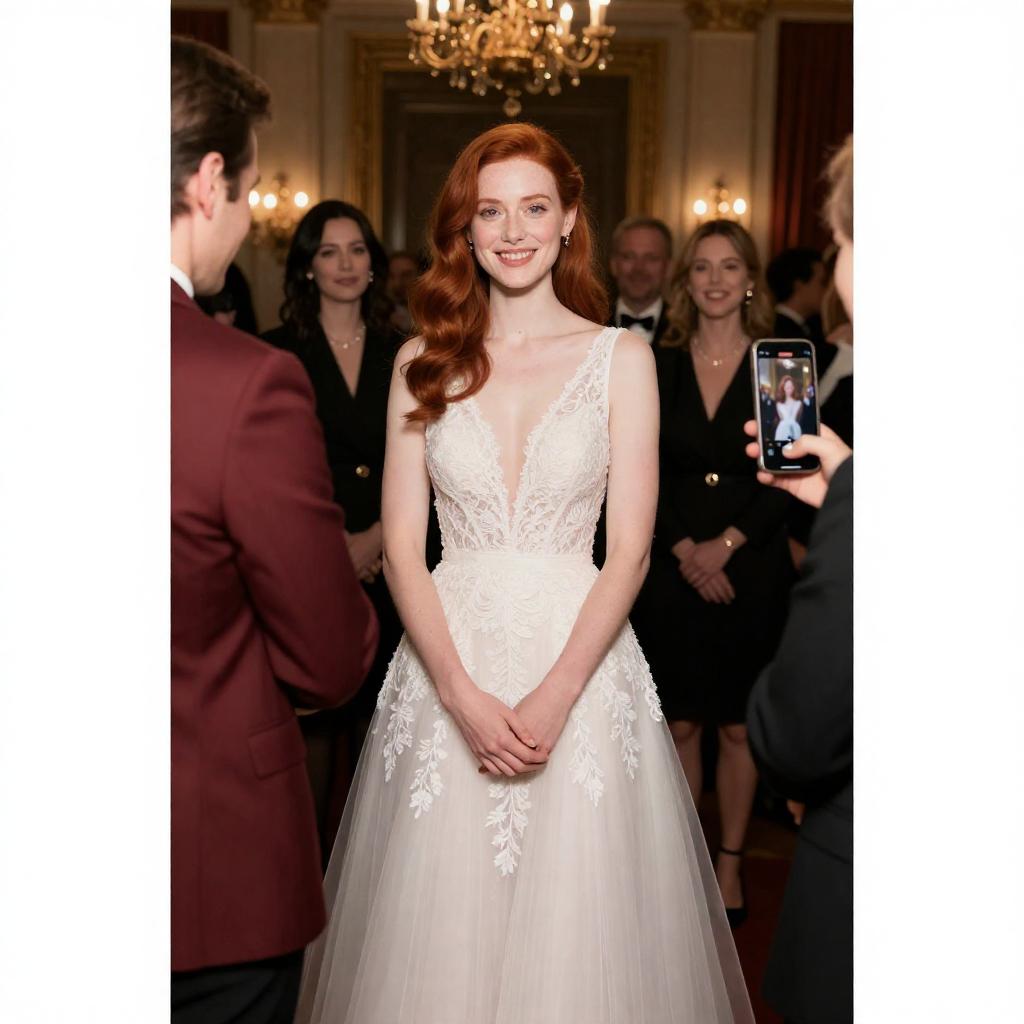 Photograph of a fair-skinned woman with red hair in an elegant updo, wearing a light blue off-shoulder dress with white lace trim and a black choker necklace. She has light blue eyes and a slight smile. Blurred green foliage in the background. Partial view of another person on the left. Natural light.