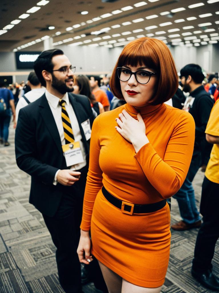 Woman in Velma Costume, candid cosplay photo at comic convention