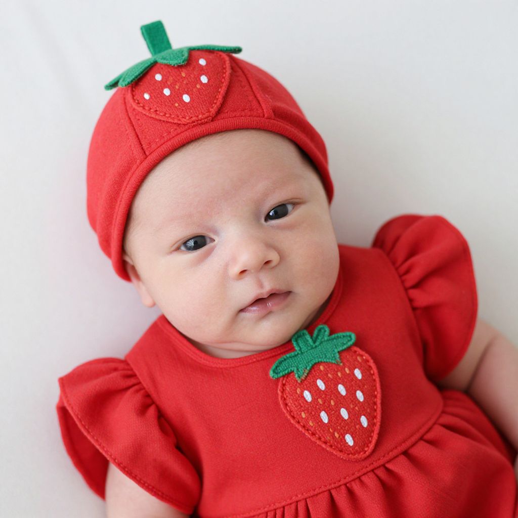 Photograph of a baby with fair skin wearing a red strawberry-themed outfit, including a hat and dress, against a white background.