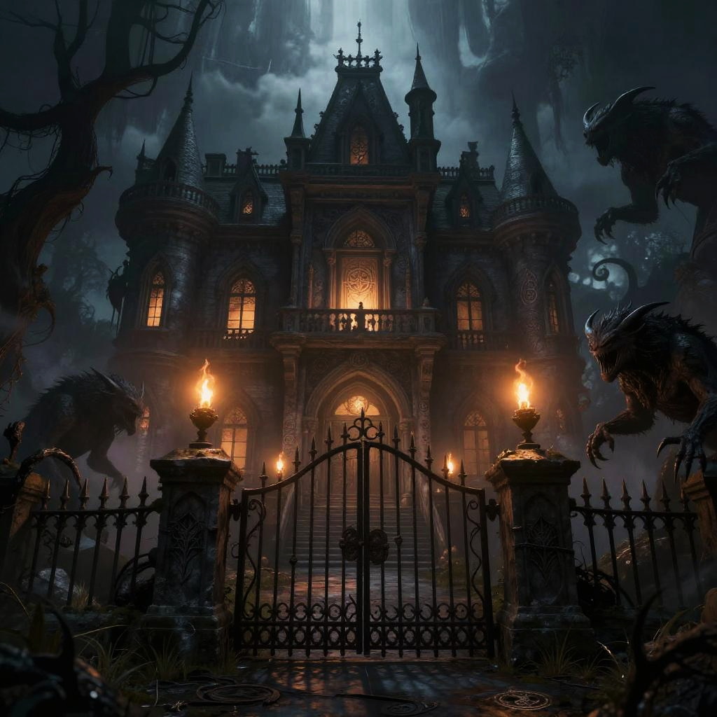 Digital Gothic horror artwork of a dark, ornate mansion with glowing windows, surrounded by fog, iron gate, and flaming torches.
