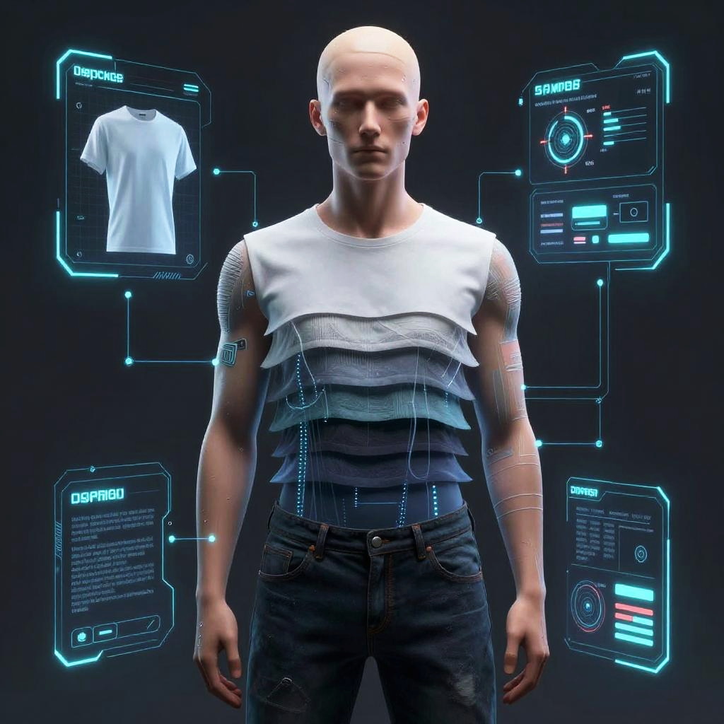 Deepfake clothes remover concept art, futuristic AI technology visualizing digital clothing layers being erased seamlessly on a human figure, high-tech interface with neon holograms, cyberpunk style, ultra-detailed, photorealistic