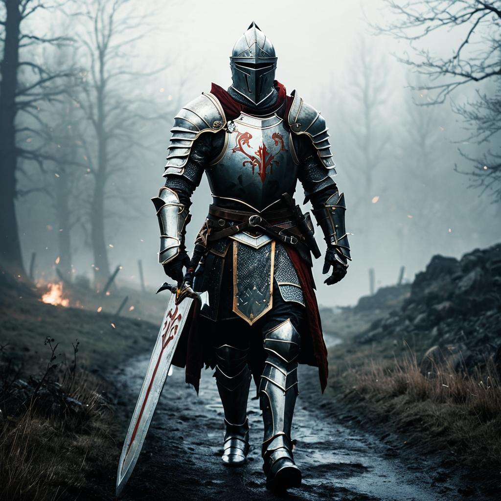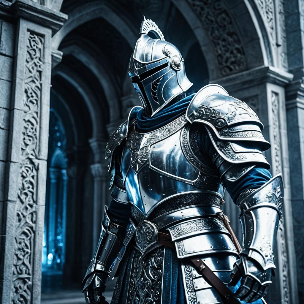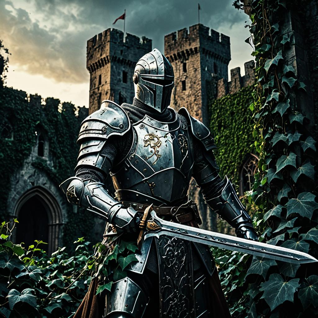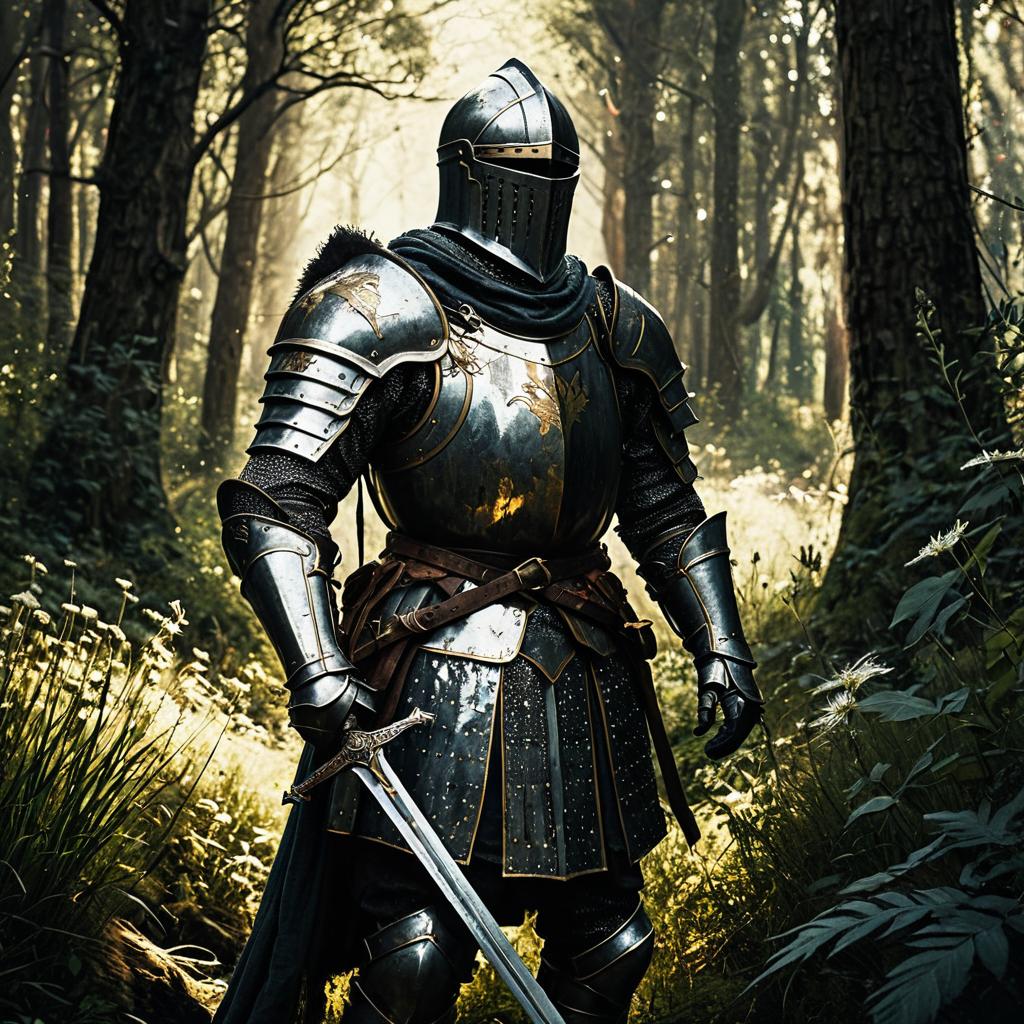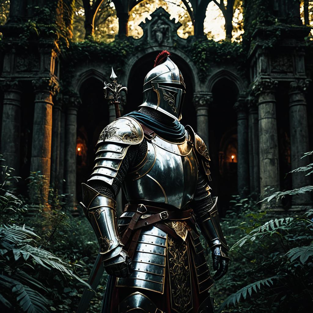 Heroic portrait of valiant knight in ornate shining armor exploring an ancient overgrown forest temple at dusk, rendered with dramatic chiaroscuro and moody colors, painterly technique inspired by Caravaggio, hyper-detailed cinematic concept art.