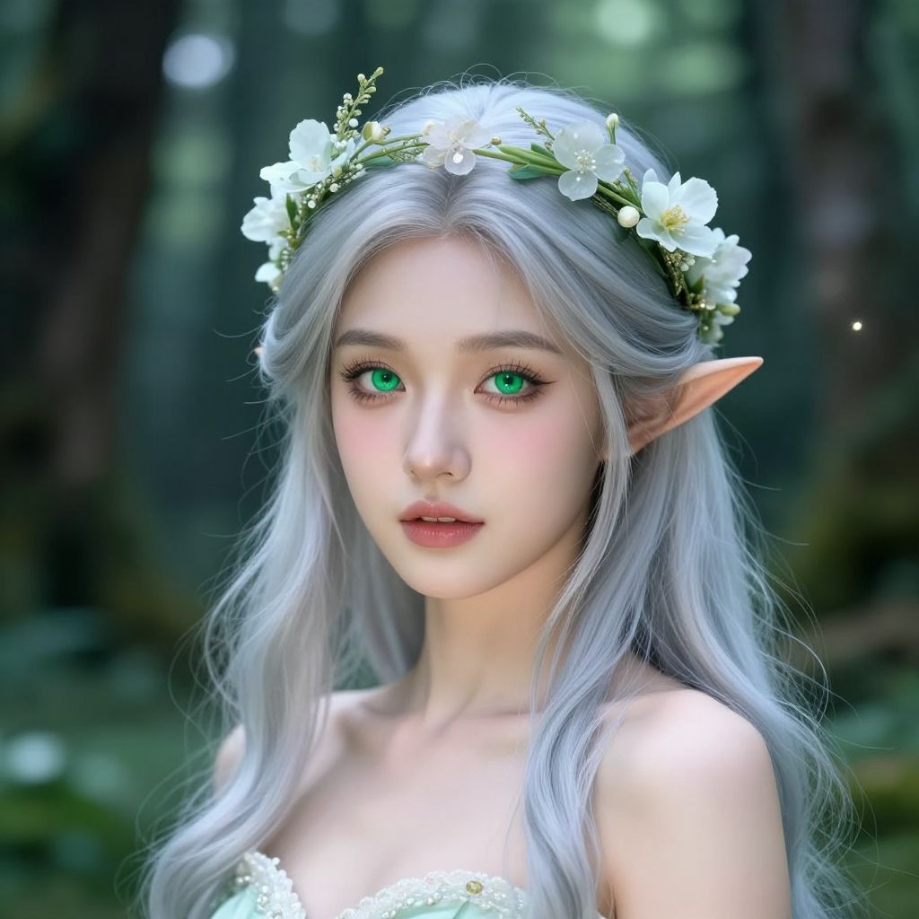 Hairstyles inspired by fantasy creatures, featuring flowing elven locks intertwined with flowers and glowing threads, dragon scale patterns in hair, rich color palettes, ethereal atmosphere, detailed close-up portraits.