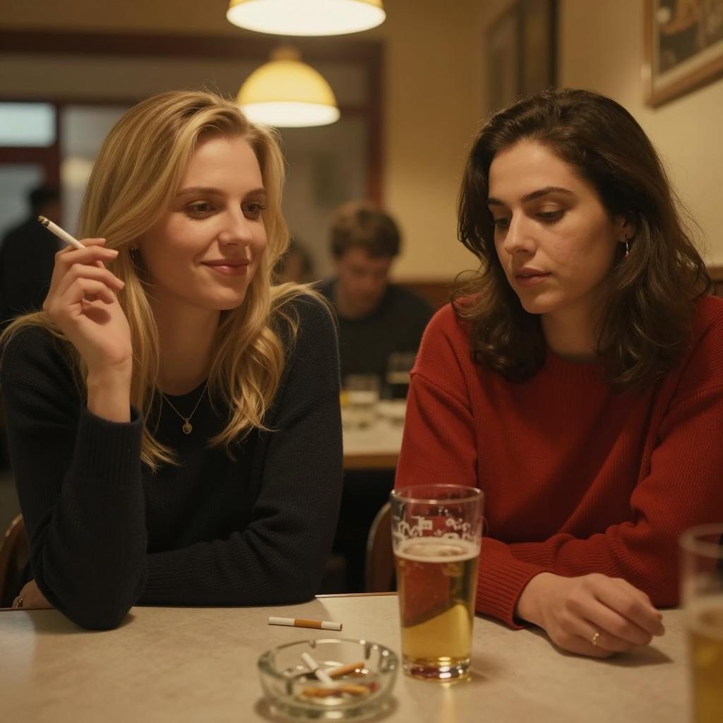 Two women at a restaurant table. Woman on left, blonde, wearing dark sweater, holding cigarette, smiling slightly. Woman on right, dark hair, wearing red sweater, looking down. Glass of beer, ashtray, and cigarettes on table. Background: dimly lit restaurant, people in the distance. Warm, yellow lighting.