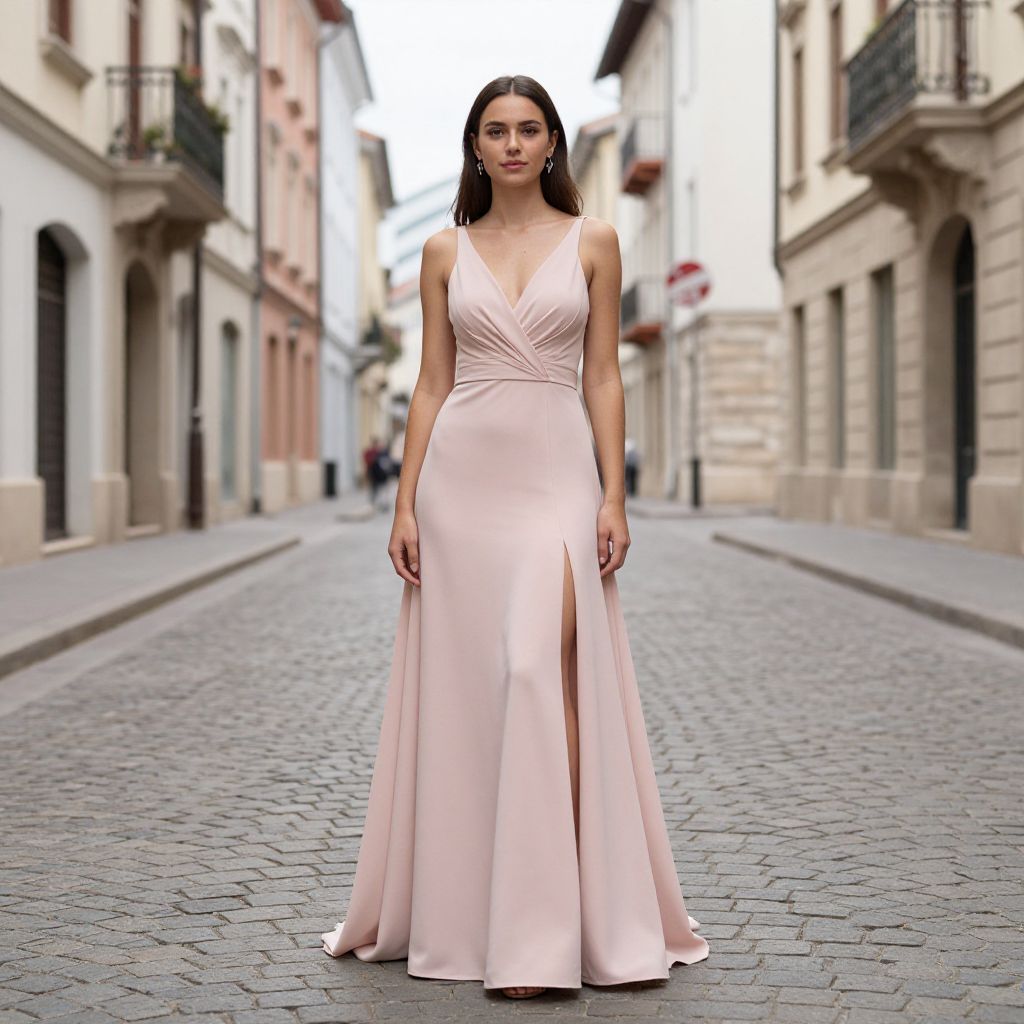 Prom Dress Europe, a woman in a pink dress standing on a cobblestone street