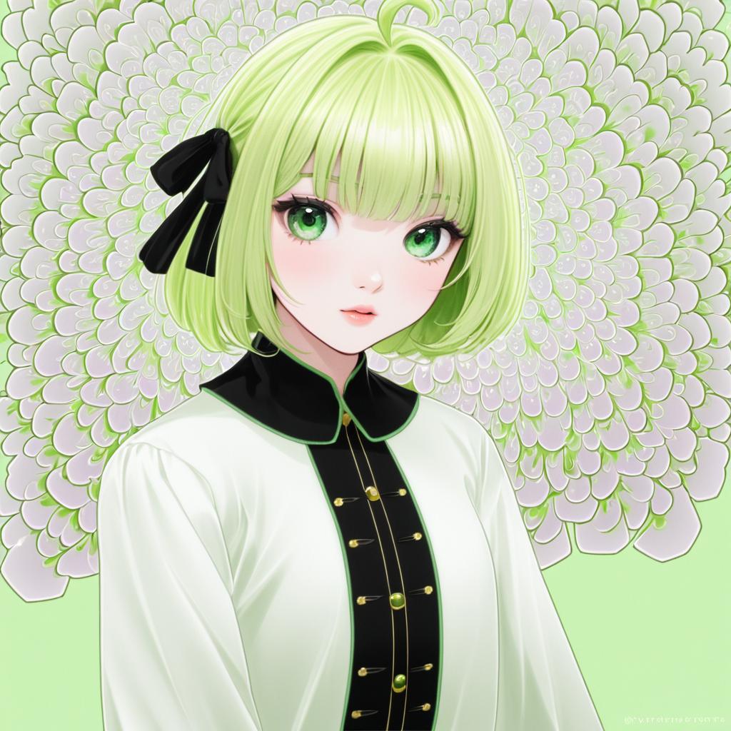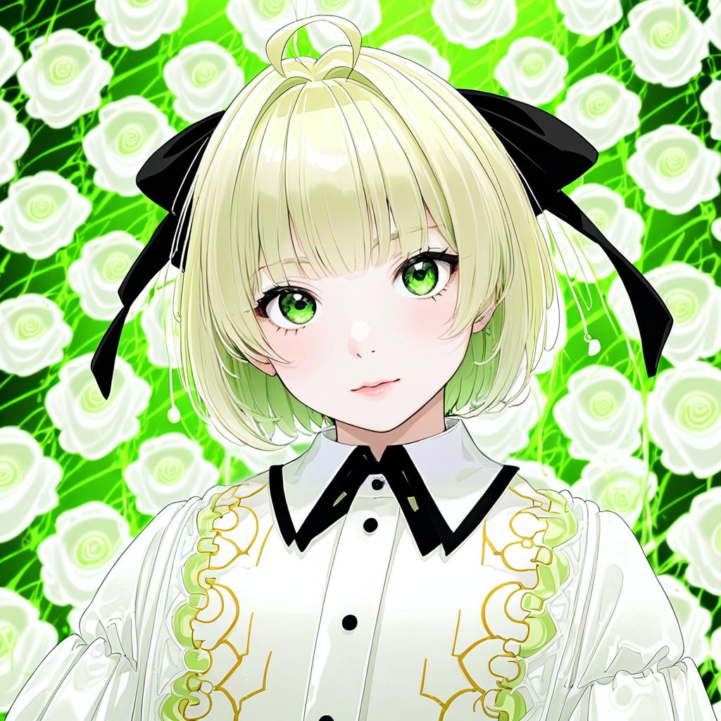 Digital anime-style illustration of a young girl with short blonde hair featuring an ahoge and black hair ribbons. She has striking green eyes and soft facial features. She wears a white long-sleeve shirt with black accents on the collar and buttons, and a ruffled pattern with yellow and light green details on the front. The background is vibrant green with stylized white roses, enhancing the character's appearance.