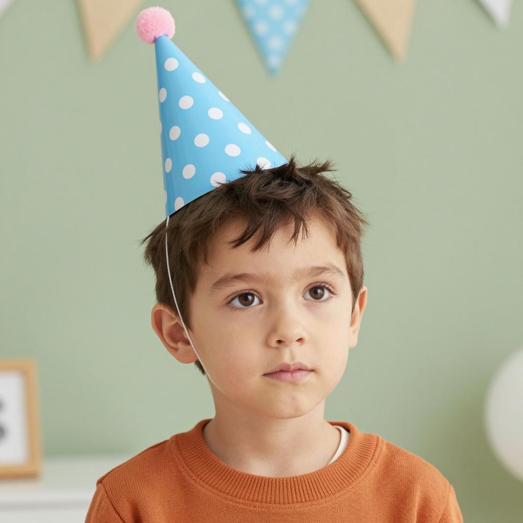 Birthday outfit tomboys, photograph of a young boy, wearing a gold cone party hat, gold button-up shirt, smiling, short brown hair, background with white curtains, pink and red flowers, orange balloons, gold "HAPPY" banner, festive, soft lighting, portrait, close-up, upper body