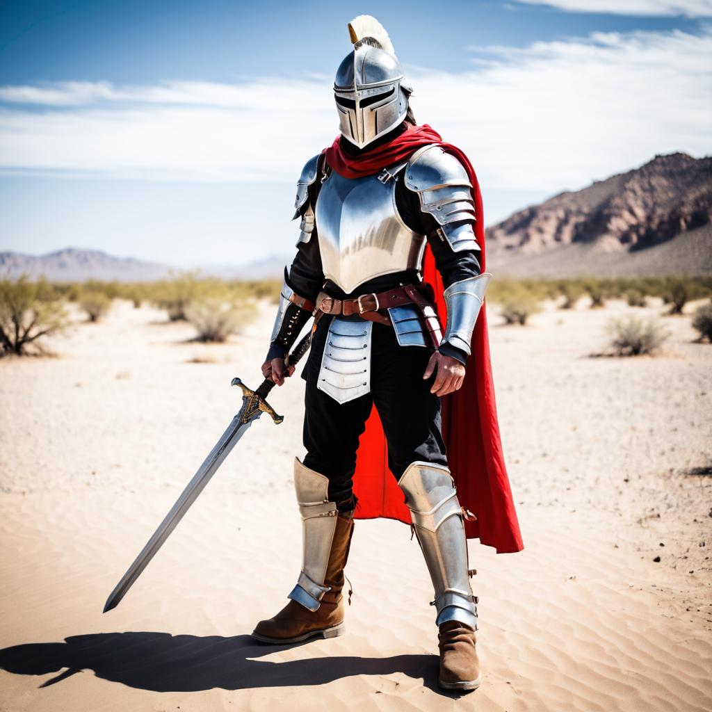 Medieval Knight in Red Cape Standing in Desert