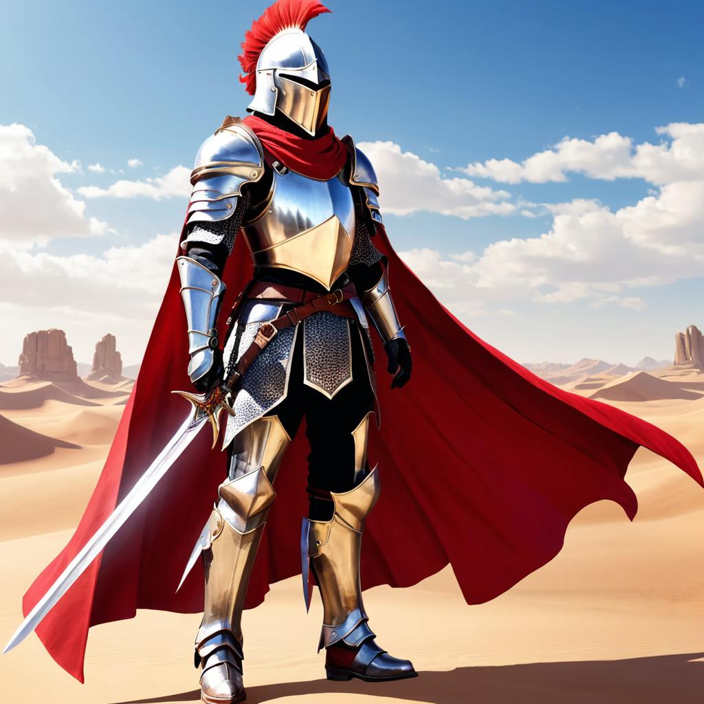 Weapon, armor, holding weapon, holding, sword, solo, helmet, holding sword, 1boy, male focus, standing, red cape, cape, shoulder armor, desert, outdoors, full body, boots, sky, breastplate, pauldrons, plume, full armor, armored boots, knight