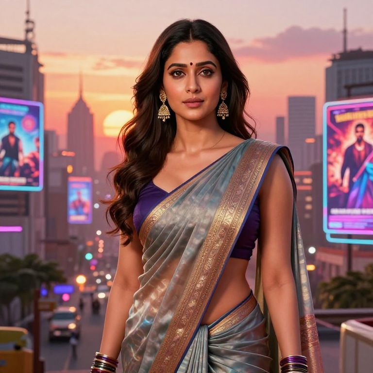 A digitally-rendered photograph of a beautiful Indian woman with long, wavy dark hair, wearing a shimmering silver and gold saree with a deep blue blouse. She has a small bindi on her forehead, intricate gold earrings, and multiple silver bangles on her right wrist. The background features a cityscape at sunset with neon billboards displaying Bollywood stars, colorful lights, and blurred buildings. The woman stands confidently in the foreground, bathed in warm, orange-pink sunset hues. The overall style is vibrant and modern, with a focus on her elegant traditional attire.
