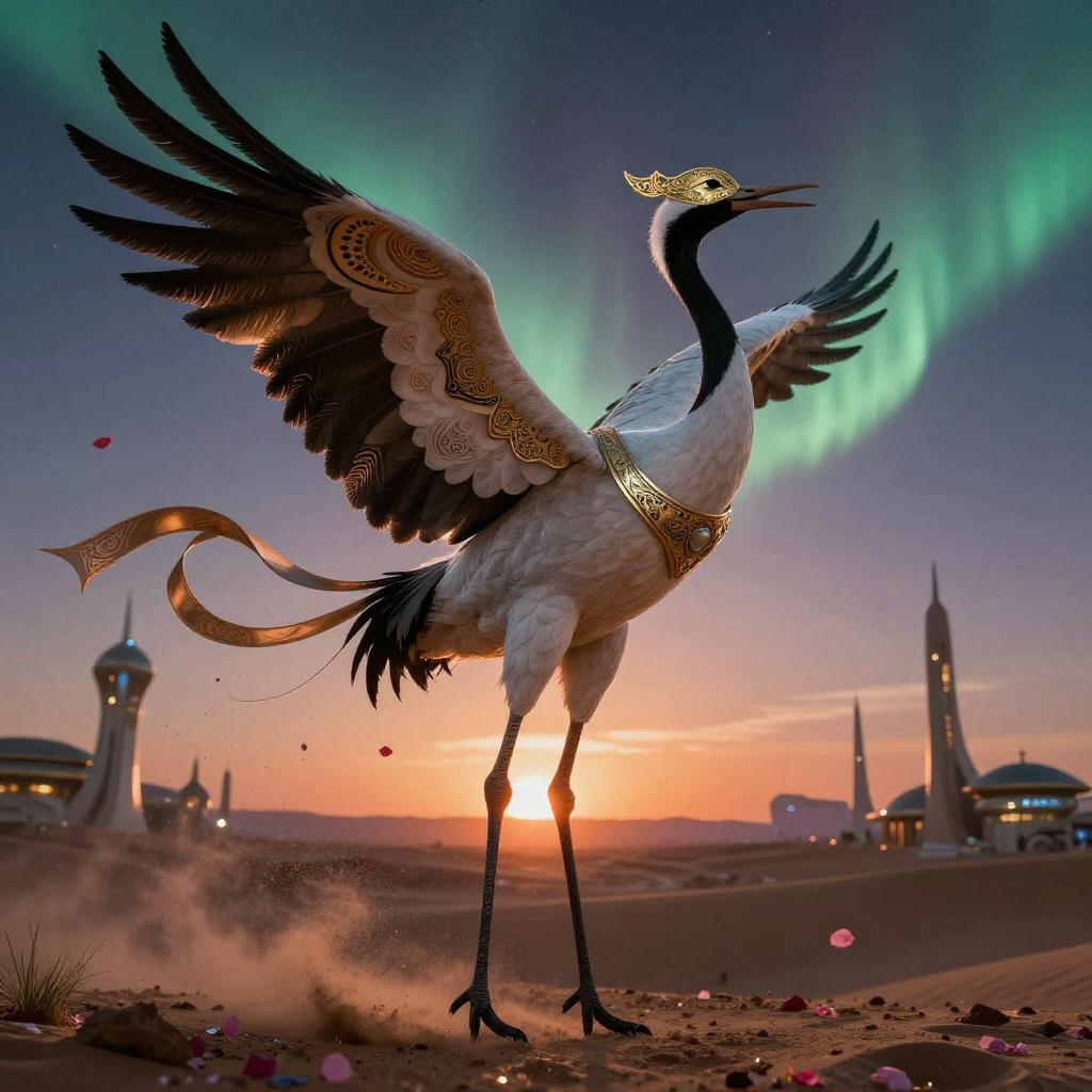 Best quality, masterpiece, ultra high res, raw photo, beautiful and aesthetic, deep shadow, dark theme, (photorealistic:1.4), elegant crane with bioluminescent plumage and a delicate gilded mask, wearing ornate alloy wing-harness entwined with flowing silk ribbons and intricate zentangle filigree, soft smile, open mouth, closed eyes, ((chiaroscuro, backlight, sunset, petals floating)), graceful poise, evocative atmosphere, magnetic presence, captivating mystique, intricate zentangle patterns, astonishing level of detail, striking perspective, a chaotic masterpiece balanced by harmony, vibrant color palette, ((outdoors)), desert ridge beneath an aurora-lit sky with distant futurist spires and drifting petal-sand, inspired by futurist architecture