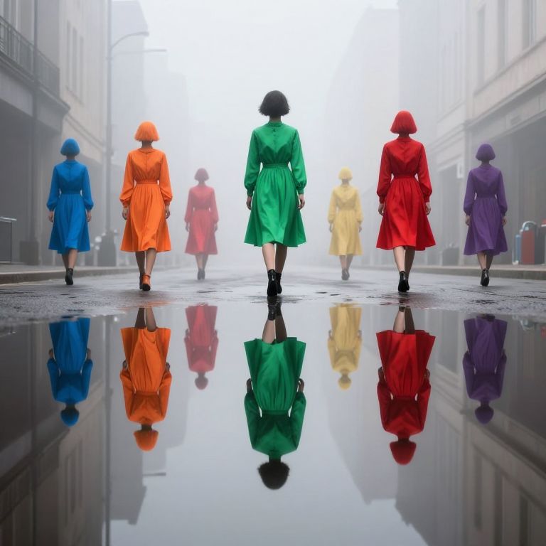 A surreal urban street bathed in soft fog, where figures in vibrant, monochromatic dresses stand motionless, their reflections perfectly mirrored in a glossy puddle below, creating an endless, dreamlike symmetry.