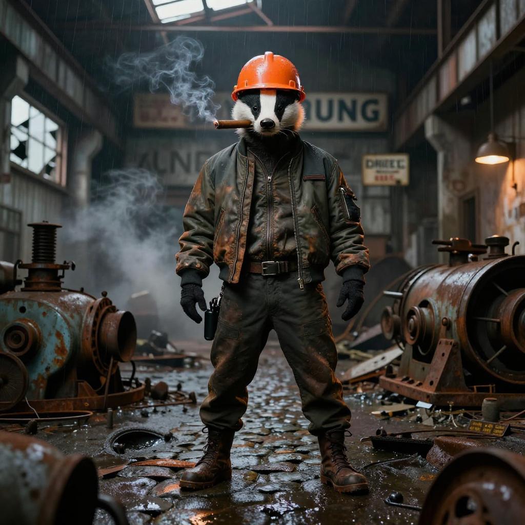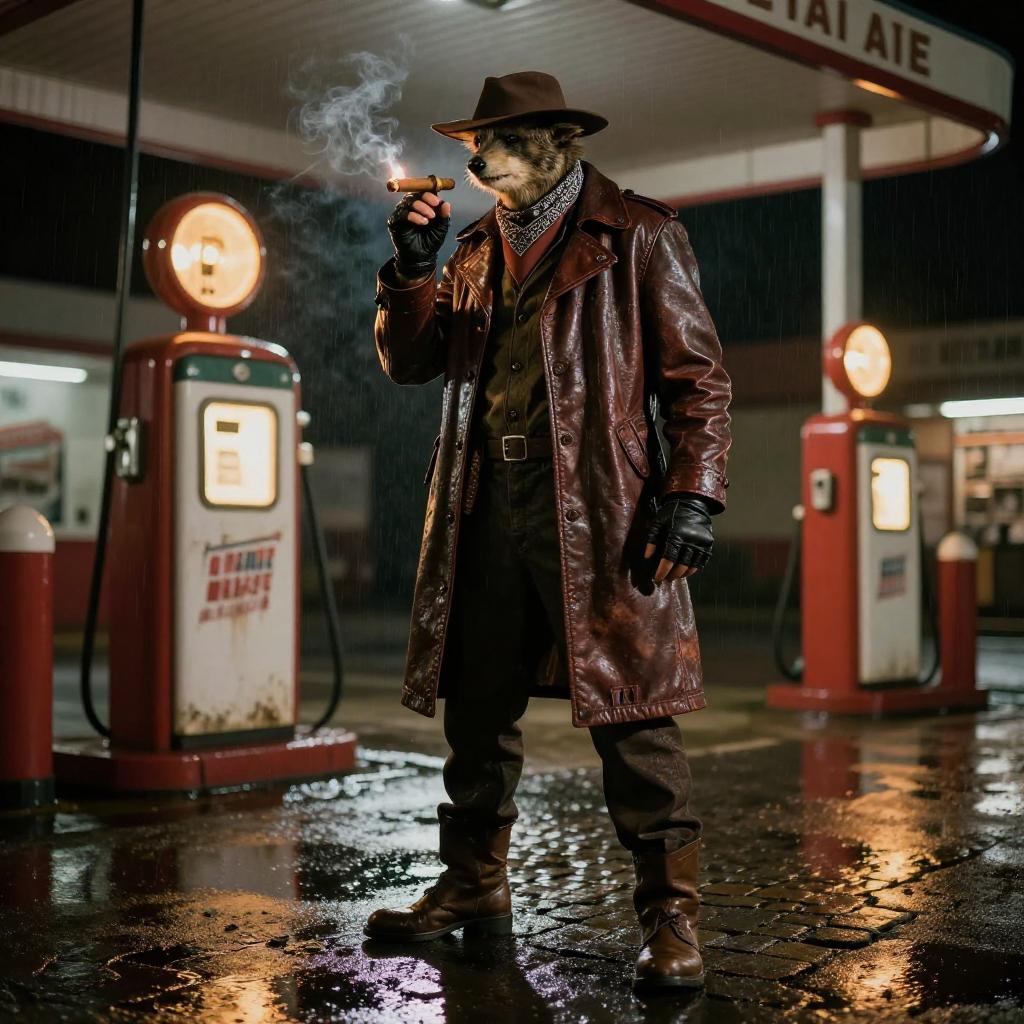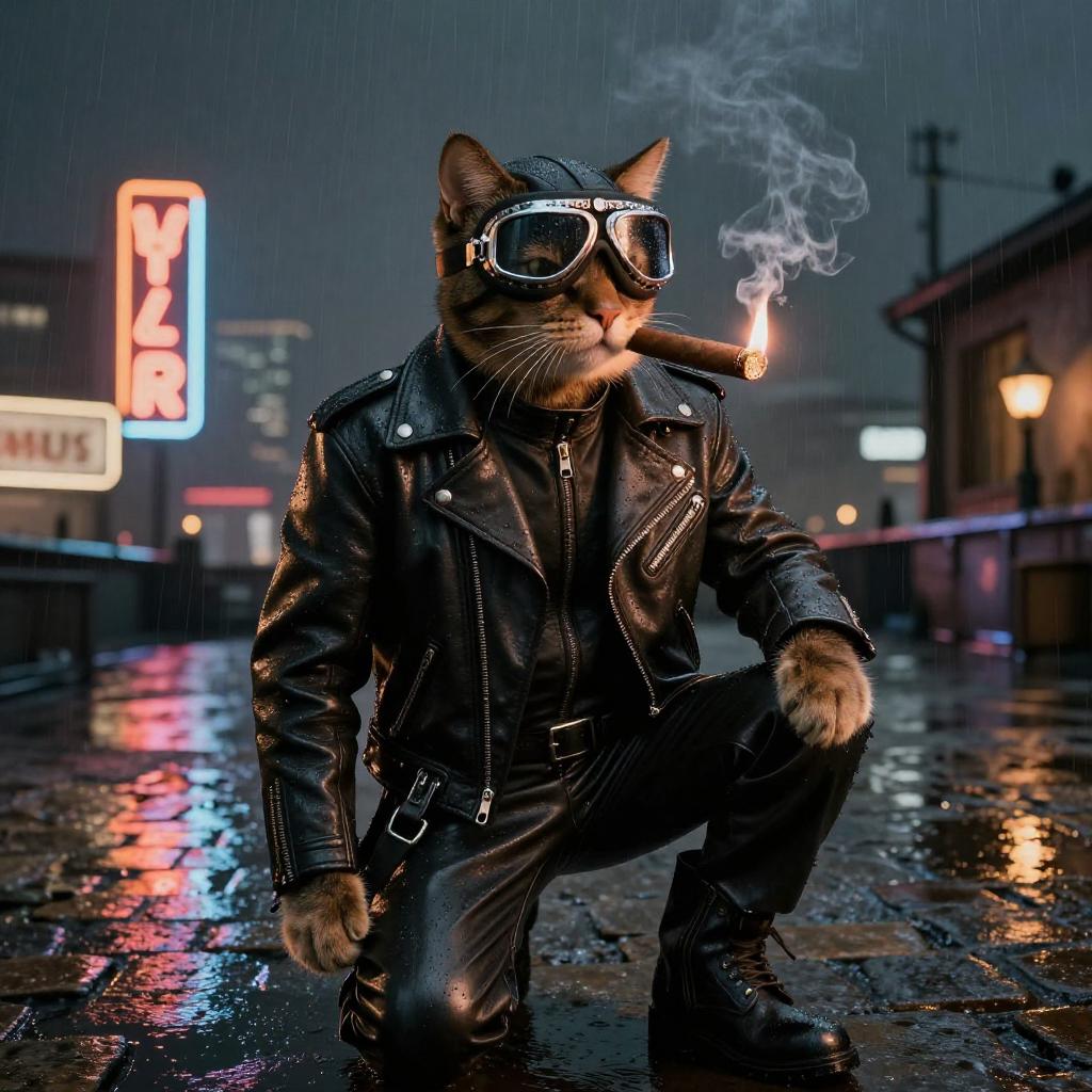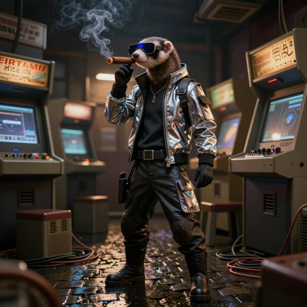 Hacker ferret in sleek reflective tech jacket with augmented reality glasses, cigar ember glowing, posed in dim arcade basement filled with outdated terminals and scattered cables, noir atmosphere, volumetric smoke, rain-slick cobblestones, period signage, reflective metal and textured fabrics, dramatic rim light outlining the silhouette, warm tungsten practicals, low-angle perspective, shallow depth of field, wet pavement reflections, cinematic composition, gritty details, SDXL photoreal, ultra-detailed, 8k, subtle grain, soft vignette, deep shadows and crisp highlights