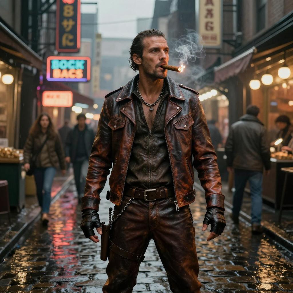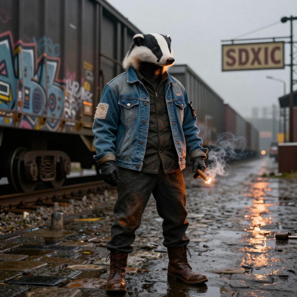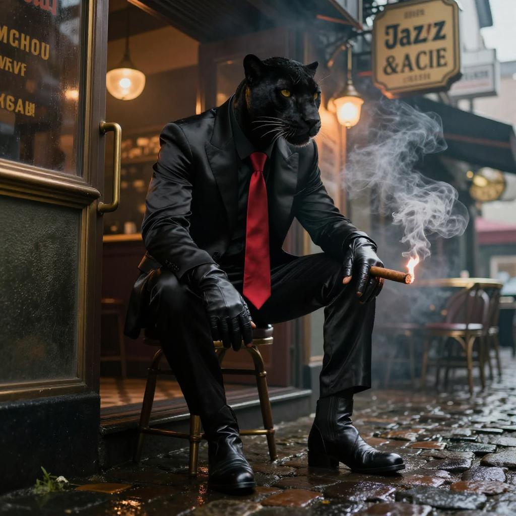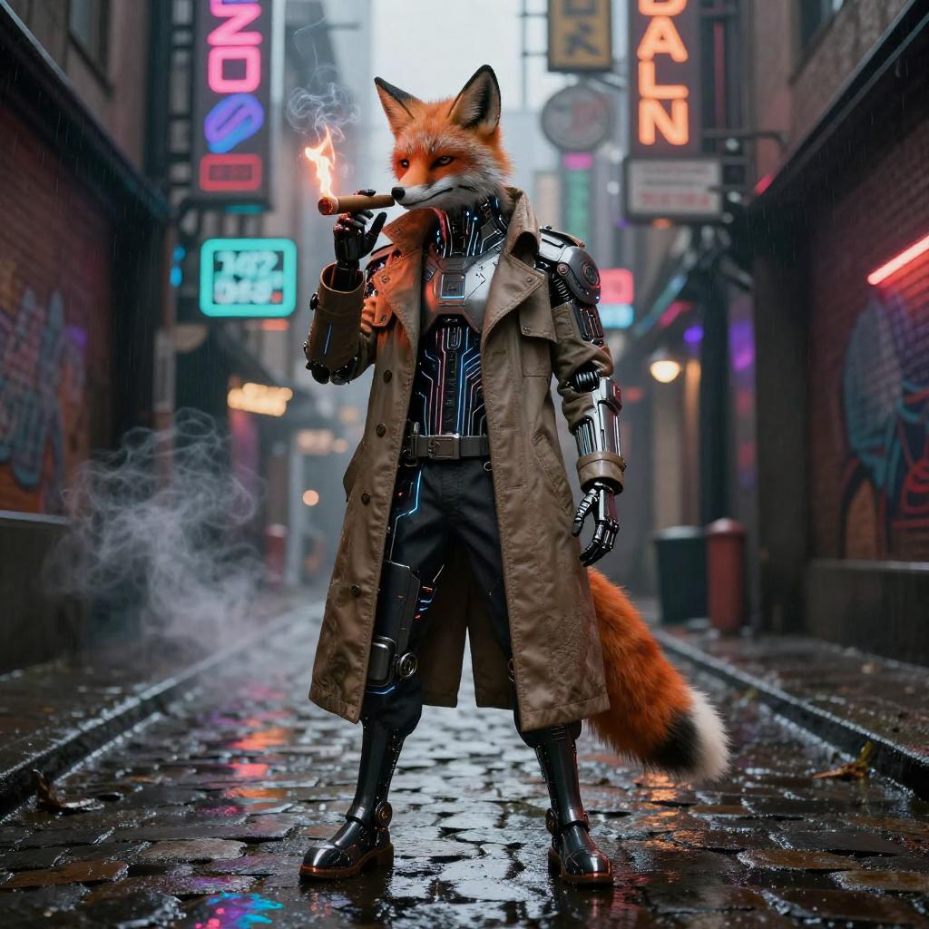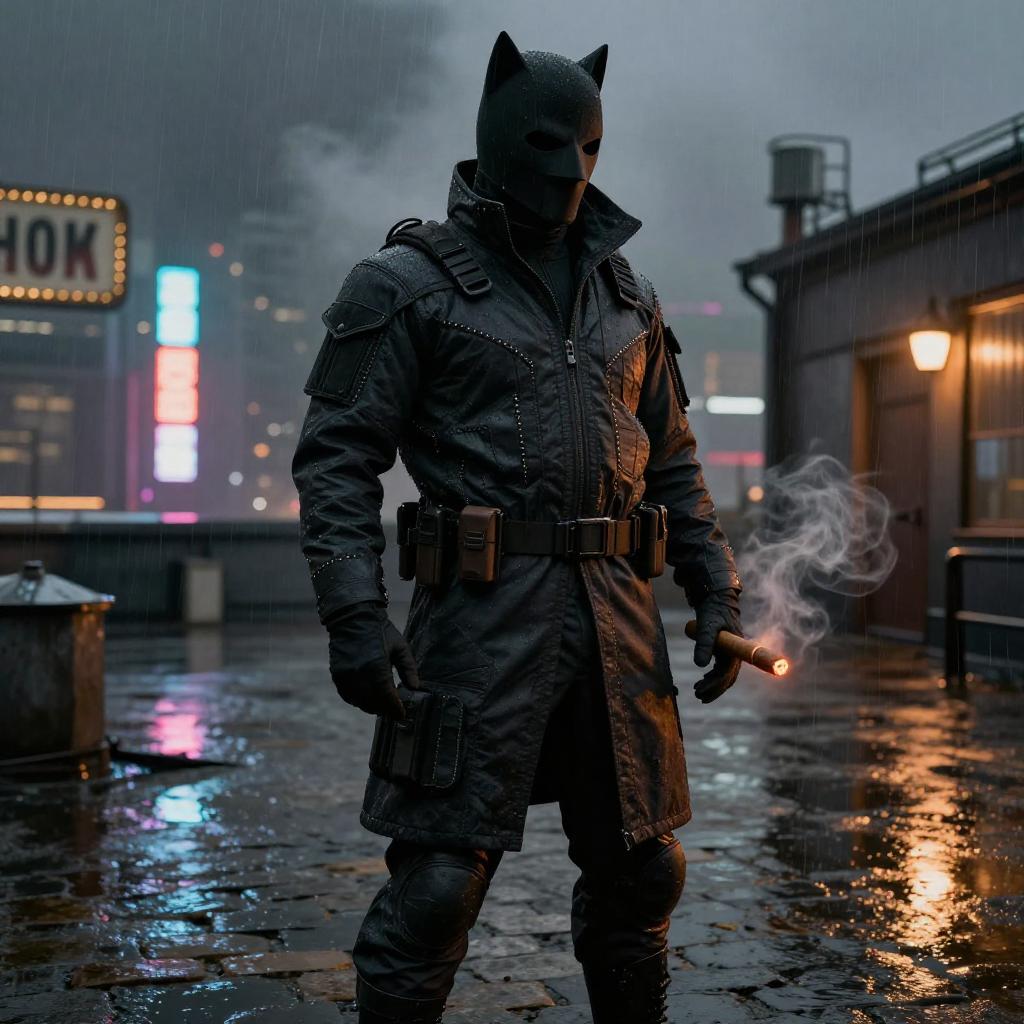 Hacker ferret in sleek reflective tech jacket with augmented reality glasses, cigar ember glowing, posed in dim arcade basement filled with outdated terminals and scattered cables, noir atmosphere, volumetric smoke, rain-slick cobblestones, period signage, reflective metal and textured fabrics, dramatic rim light outlining the silhouette, warm tungsten practicals, low-angle perspective, shallow depth of field, wet pavement reflections, cinematic composition, gritty details, SDXL photoreal, ultra-detailed, 8k, subtle grain, soft vignette, deep shadows and crisp highlights