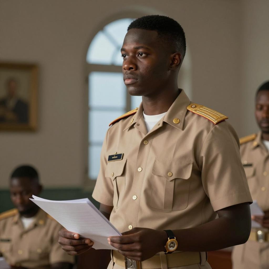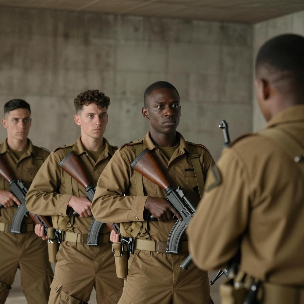 Four soldiers in a dimly lit, concrete-walled room. All wear tan military uniforms, armed with rifles. One soldier on the right is facing away, others face him. Dark-skinned man in the center has a serious expression. Soldier on the left has short dark hair, intense gaze. Soldier in the middle has curly dark hair, focused expression. Background wall is rough and aged. Warm lighting.