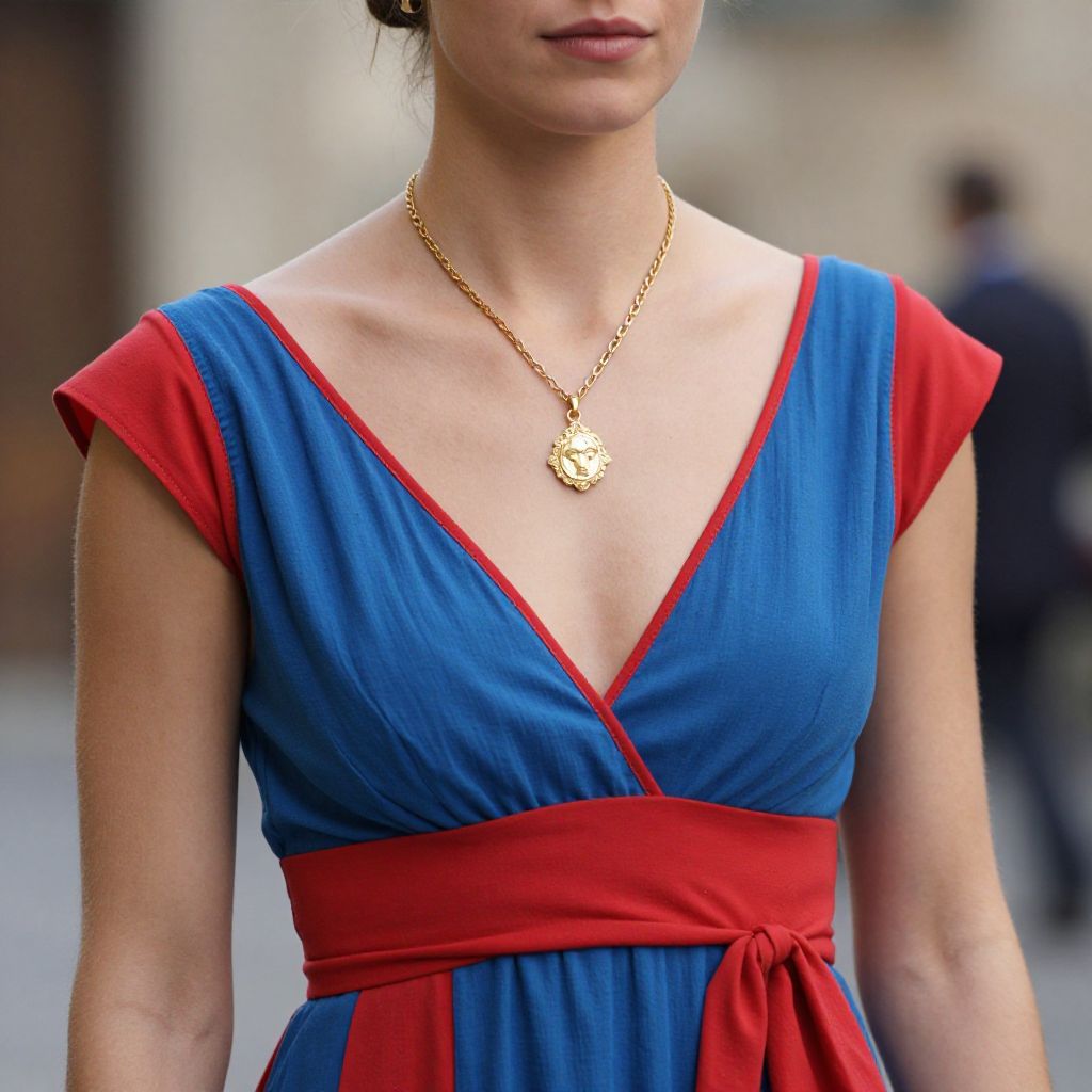 "Woman Roman, a woman in a blue and red dress with a gold necklace"