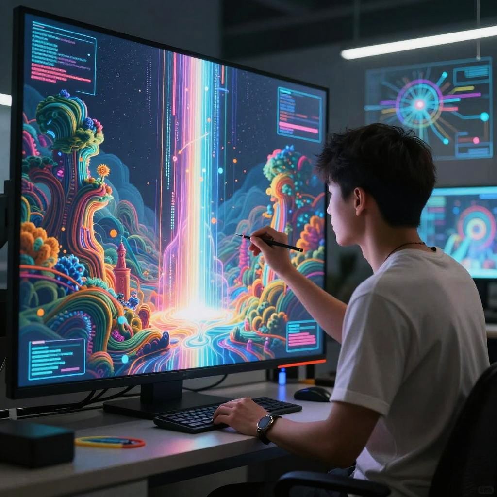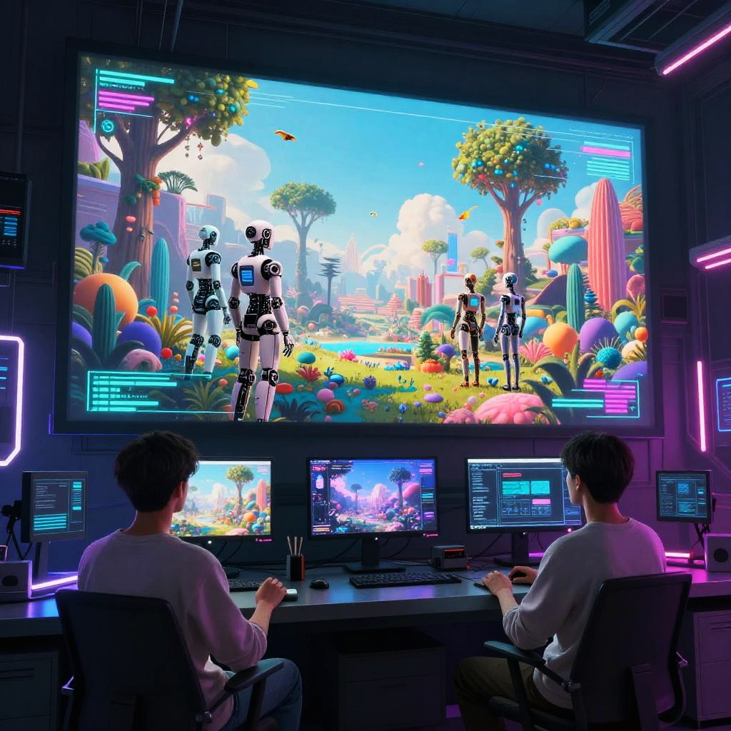 AI program for art, robots and humans co-creating vivid surreal landscapes on large screens, data streams transforming into art, a cyberpunk style art studio filled with neon lights and digital tools, harmonious integration of AI in creative processes