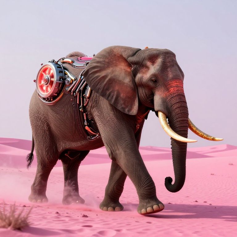 A majestic elephant adorned with a glowing, mechanical wheel on its back strides through a surreal desert of luminous pink sand, its golden tusks and fiery eyes defying the boundaries of nature and machinery.