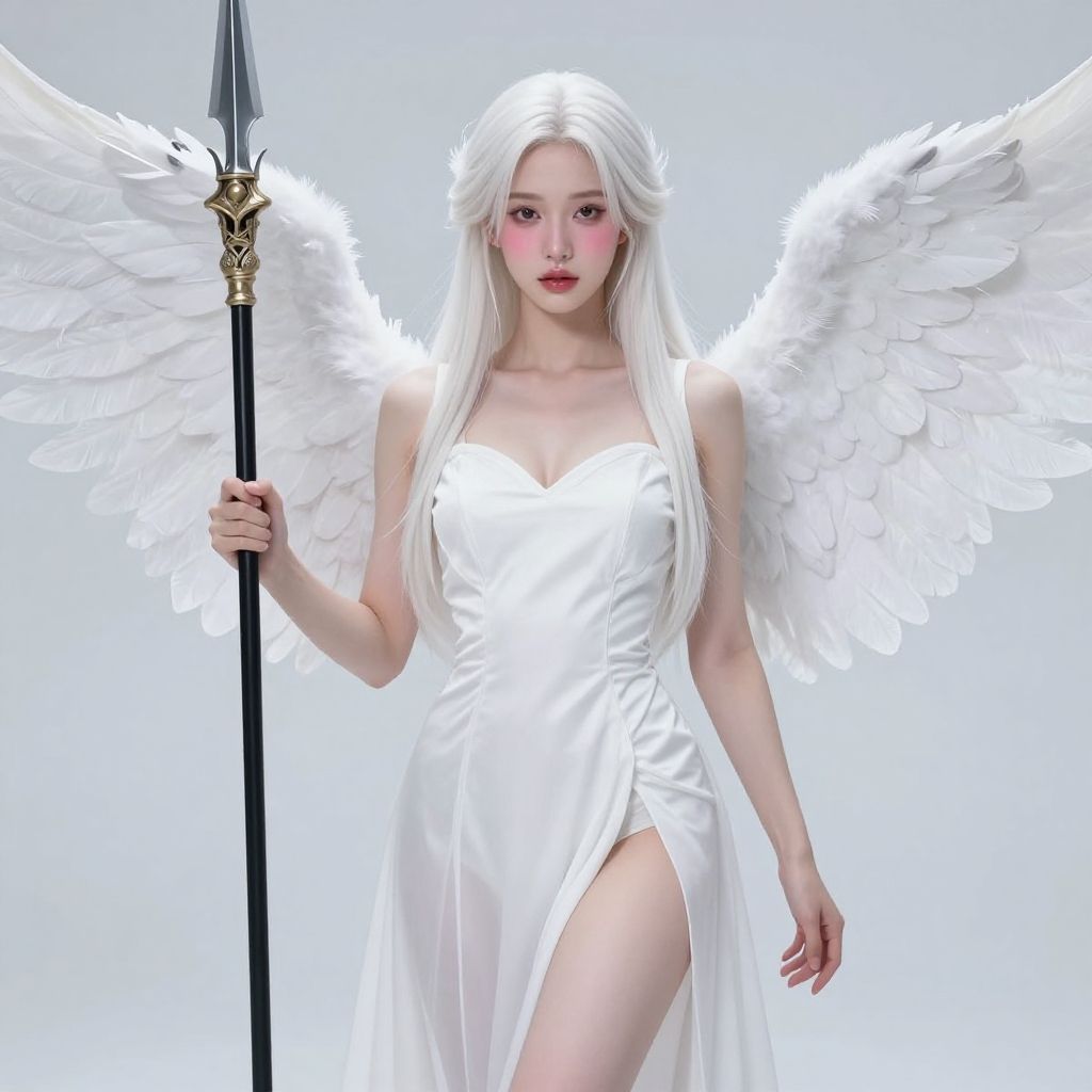Digital artwork of a young, fair-skinned woman with long, straight white hair, wearing a white, strapless, satin dress with a high slit. She has large, detailed white angel wings and holds a black spear with a golden tip in her right hand. Her eyes are pink, and she has pink lipstick. The background is a gradient of white to light blue, adding a celestial feel. The image has a realistic, CGI style with smooth textures and sharp details.