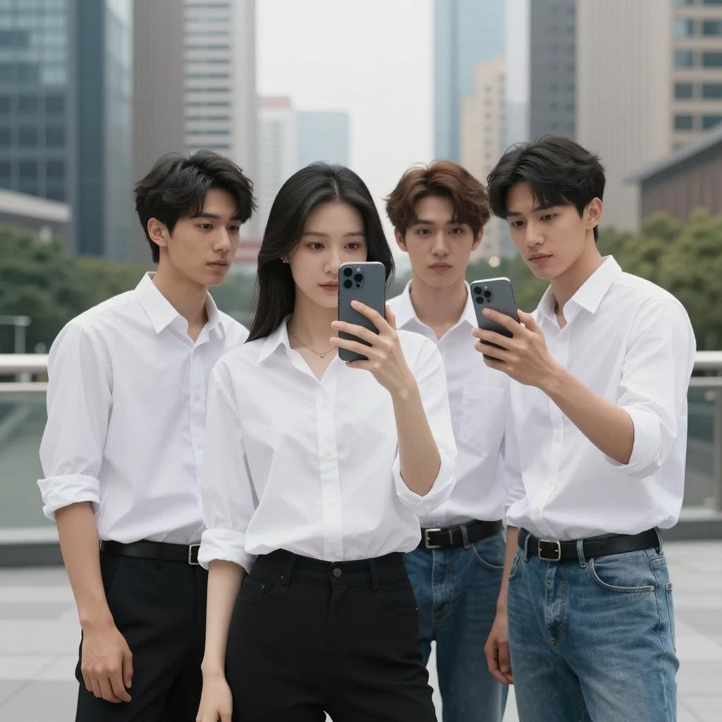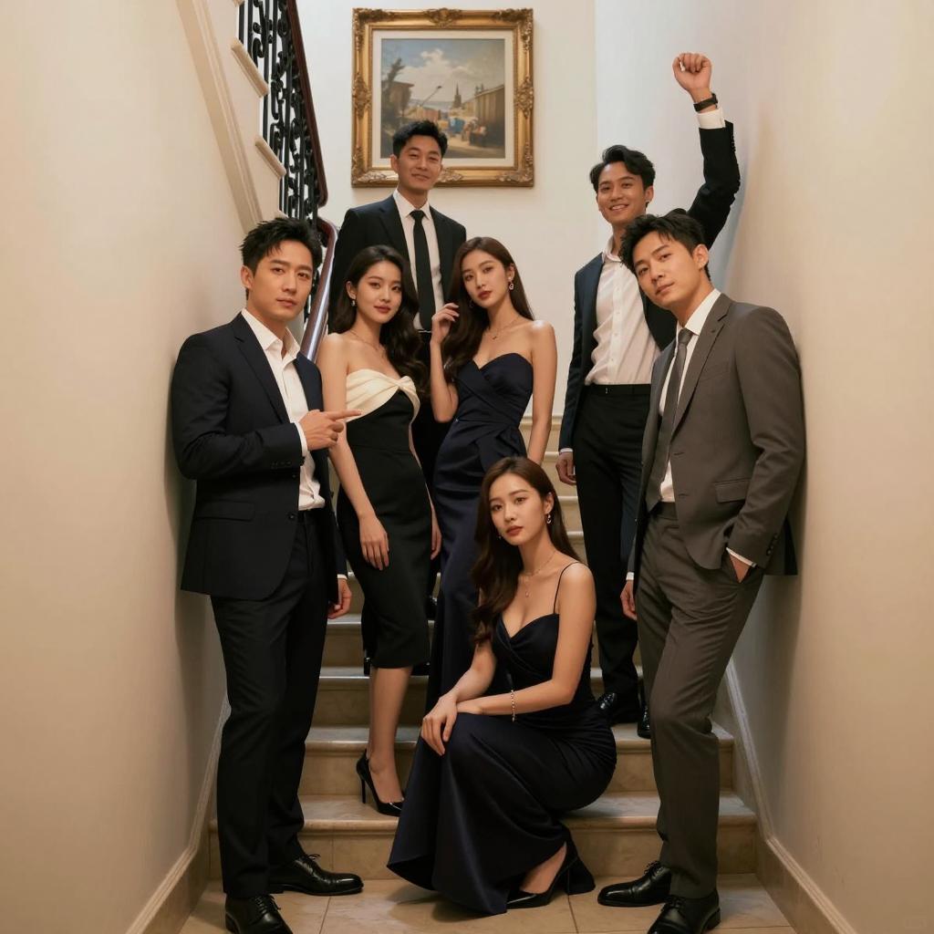 Three young adults of East Asian descent posing against a plain background with film equipment. A woman with long dark hair and intense expression wears a black spaghetti strap dress. She is held protectively by a man in a light shirt with rolled-up sleeves, showing a concerned expression. Another man in a dark suit and tie stands on the left holding a vintage-style film camera, looking serious.