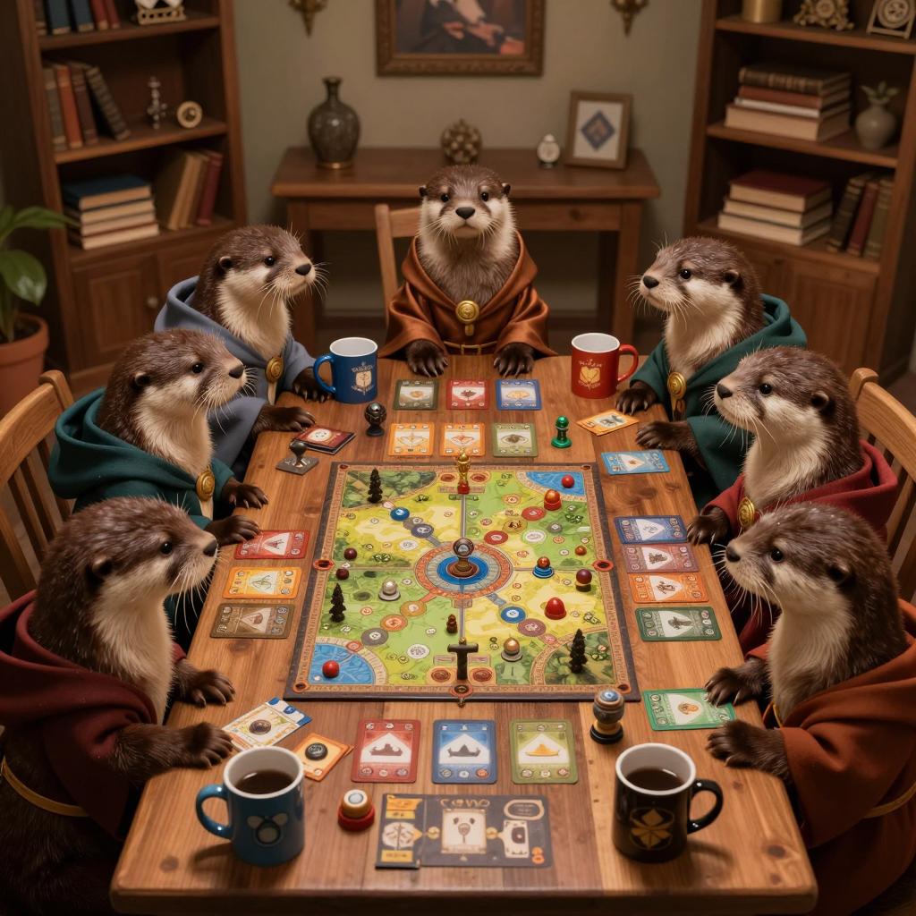 A group of six otters dressed in fantasy-themed robes gathered around a wooden table playing a tabletop role-playing game. The setting is a cozy, warmly lit room with shelves holding books and decorations. Various game pieces, cards, and mugs are arranged meticulously on the table, highlighting a detailed fantasy board game setup.