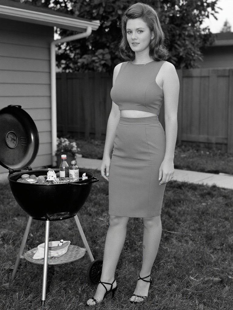 A woman, in a chic monochrome two-piece with a crop top and pencil skirt, strappy black heels, standing in a 1960s suburban backyard barbecue, captured in the visual style of Gottfried Helnwein. Sexy. Pretty face and beаutiful eyes. Big breasts