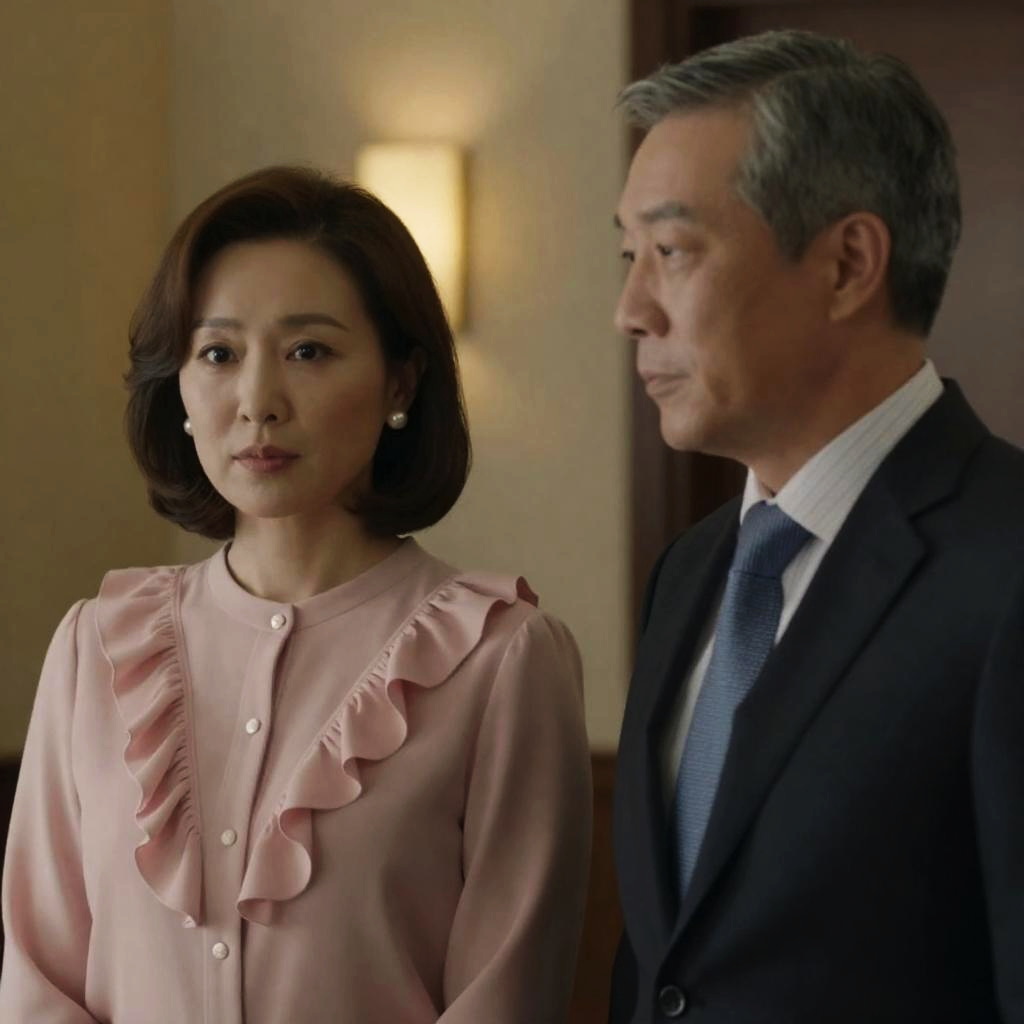 Black-and-white photograph of two people. Woman with medium-length dark hair, serious expression, wearing dark coat, stands left. Man with dark hair, intense expression, wearing suit over light shirt, stands right. Background has ured wall, blurred plants. Man slightly leans forward.