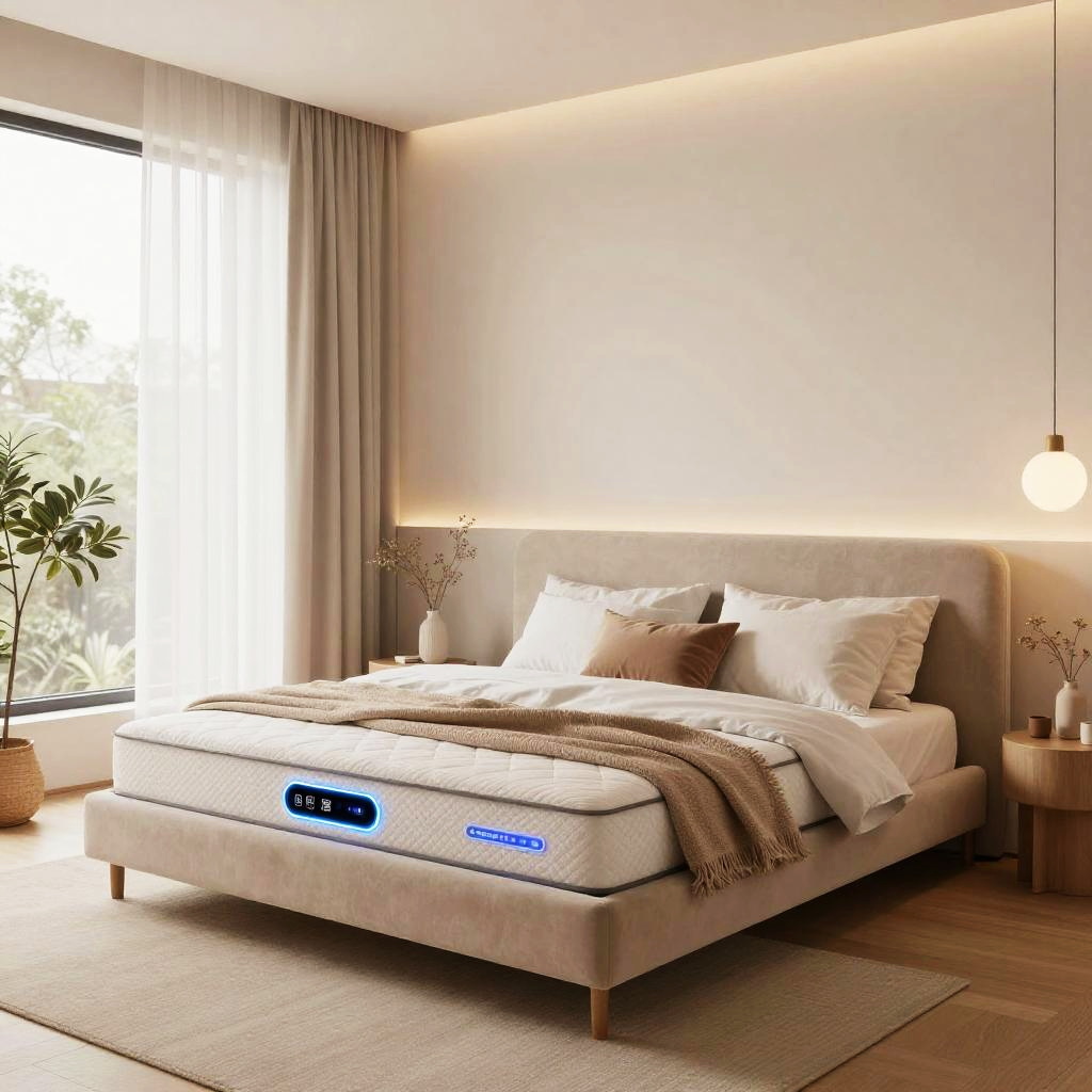 Modern bedroom photograph with a smart bed, beige upholstered frame, white pillows, brown throw, soft lighting, potted plant, and large window.