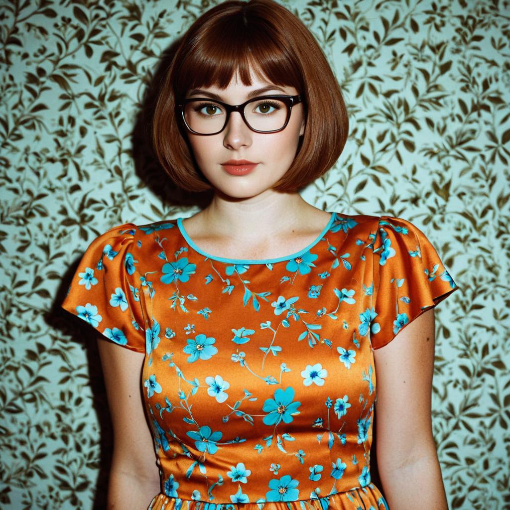 Velma scooby doo fancy dress,1girl, solo, glasses, dress, brown hair, short hair, floral print, short sleeves, arm behind back, freckles, lips, looking at viewer