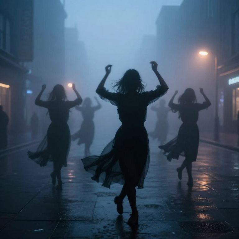 In a fog-shrouded urban twilight, shadowy figures emerge as ethereal dancers, their forms dissolving into a collective, fluid motion that defies gravity and reason, creating a surreal spectacle where reality blurs into an endless, dreamlike waltz.