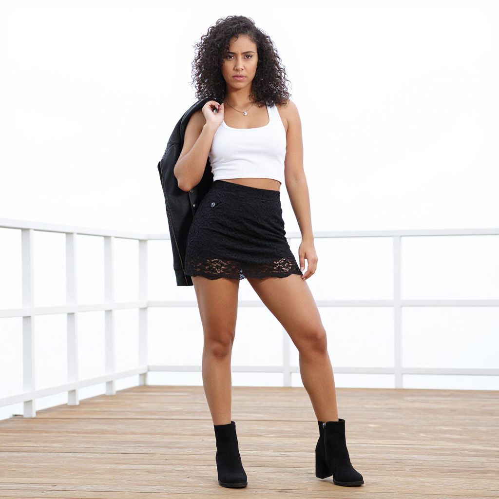 Photograph of a young woman with medium skin tone, black hair, wearing a straw hat, denim jacket, black bralette, skirt, and black