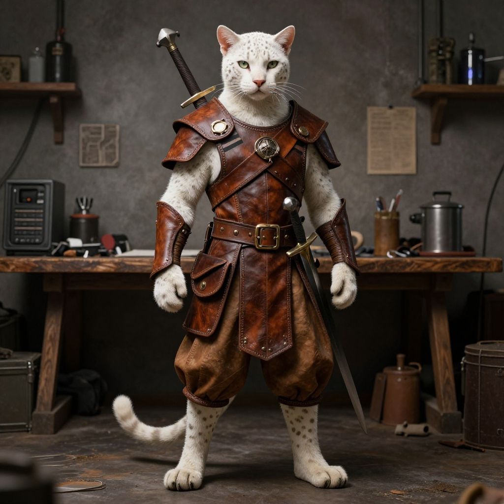 Digital art of a muscular, white-spotted leopard cat in medieval armor with a sheathed sword, standing in a dim, cluttered workshop.