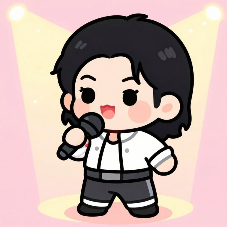 Cute chibi Michael Jackson singing with microphone, sparkling glove, cartoon style, pastel colors, spotlight effect, fun and cheerful atmosphere