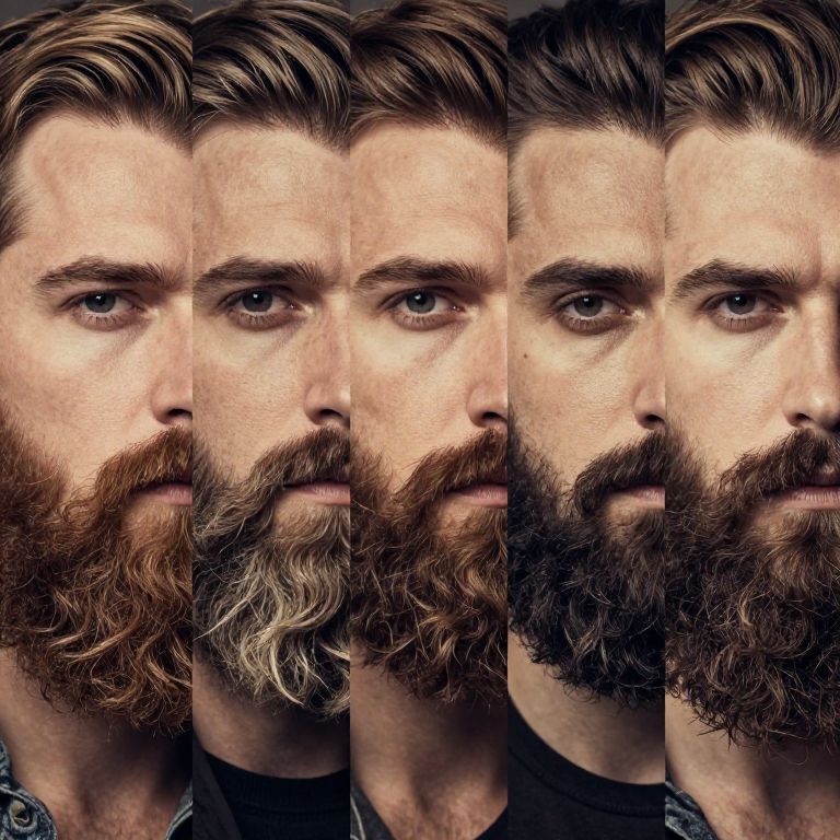 Photograph of a Caucasian man with a full, wavy brown beard and dark brown hair, shown in five identical close-up profiles, highlighting his serious
