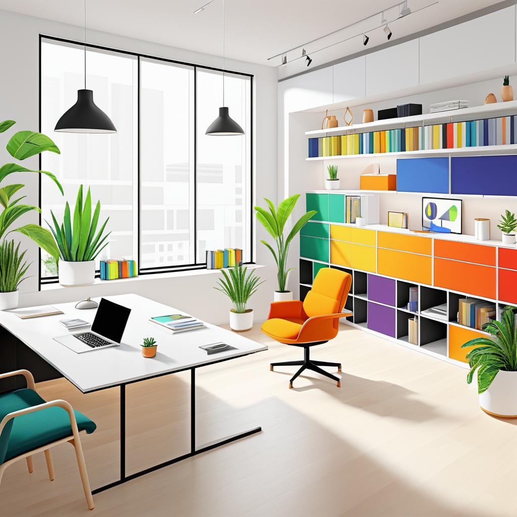 Bright contemporary office interior featuring minimalistic design, large windows, pendant lamps, colorful shelving units, indoor plants, and office accessories arranged neatly. The office space is well-lit with natural sunlight and showcases a vibrant yet clean aesthetic with an orange swivel chair and multiple vibrant-colored storage compartments.