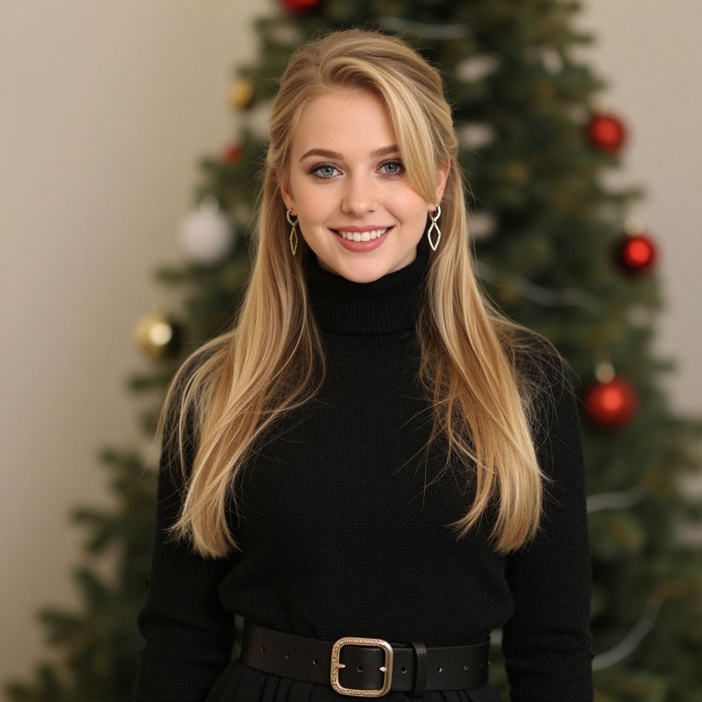 Photograph of a smiling blonde woman with long, straight hair parted slightly to the side, wearing a black turtleneck sweater and black pants with a belt featuring a gold buckle. She has fair skin, blue eyes, and is wearing large silver hoop earrings. In the background, there is a Christmas tree adorned with red and gold ornaments, slightly out of focus, against a beige wall. The woman's makeup is subtle, with a natural look, and she exudes a friendly, approachable demeanor. The image has a soft, warm lighting.