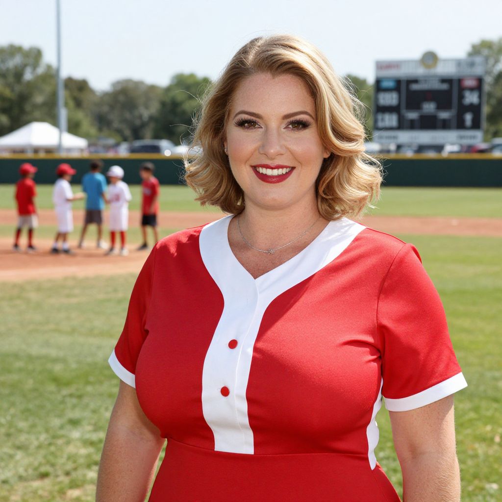 A vibrant plus size baseball dress in bright red and white, worn by a cheerful woman with warm brown eyes and soft blonde hair, standing on a sunny baseball field during a summer festival, with kids playing in the background and a retro-style scoreboard in the distance.. The woman has big tits and cute face